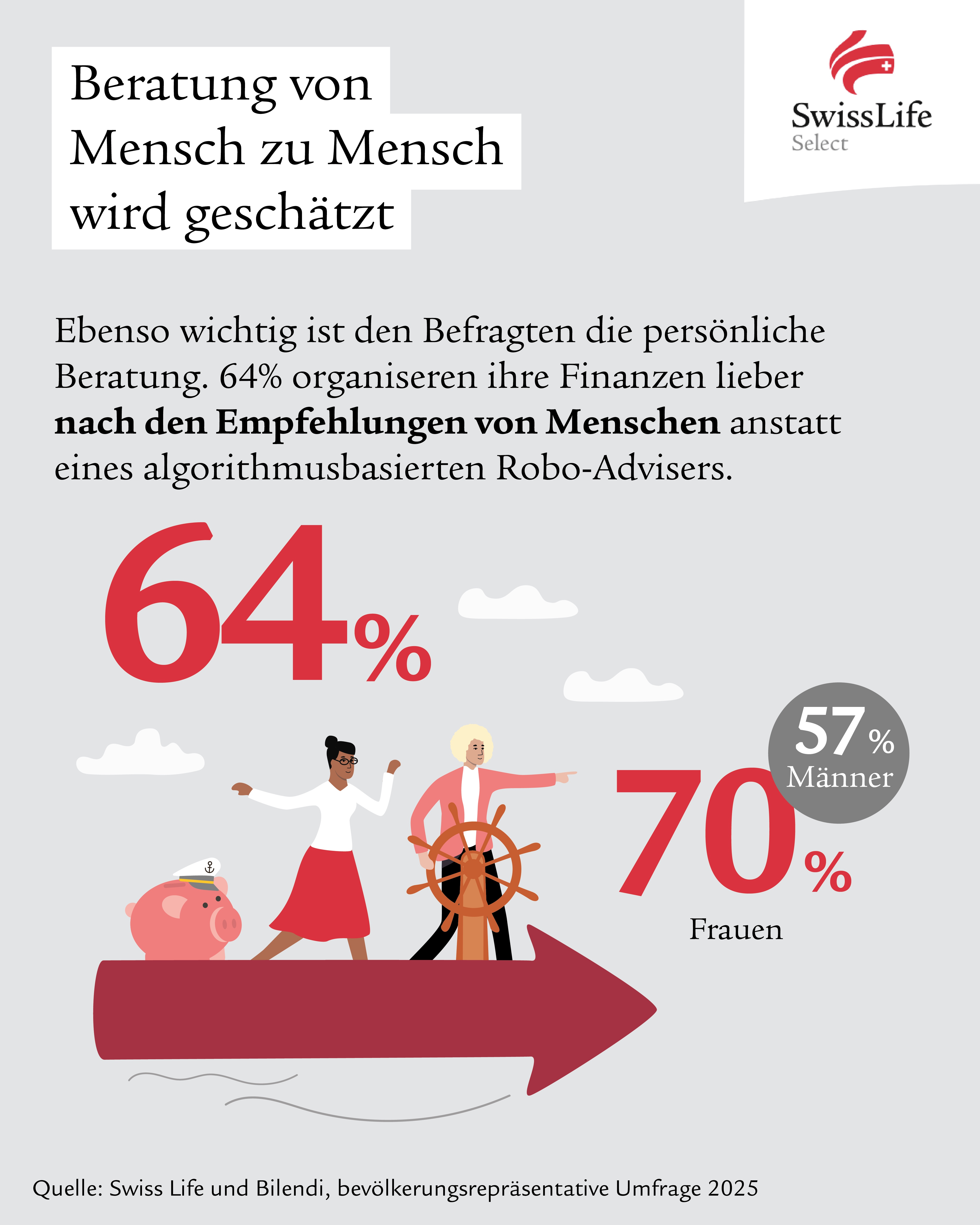 Wie eine aktuelle und bevölkerungsrepräsentative Umfrage des Marktforschungsinstituts Bilendi[2] belegt, wünschen sich die Österreicherinnen und Österreicher gerade in wirtschaftlich unsicheren Zeiten einen ehrlichen und kompetenten Finanzberater oder Finanzberaterin an ihrer Seite, um Finanz- und Vorsorgefragen zu lösen. Knapp zwei Drittel (62 %) der Befragten geben an, dass Finanzberatung, auf die man sich verlassen kann, immer wichtiger für sie wird. Ebenso wichtig ist für Herr und Frau Österreicher die persönliche Beratung durch einen Finanzexperten oder eine Finanzexpertin. Demnach sagen satte 64 Prozent der Befragten, dass sie ihre Finanzen lieber nach den Empfehlungen eines Menschen anstatt eines algorithmusbasierten Robo-Advisers organisieren. Besonders ausgeprägt ist dieser Wert bei Frauen (mehr als 70%). Weit weniger, aber immer noch großen Wert auf persönliche Beratung legen Männer mit 57 Prozent.