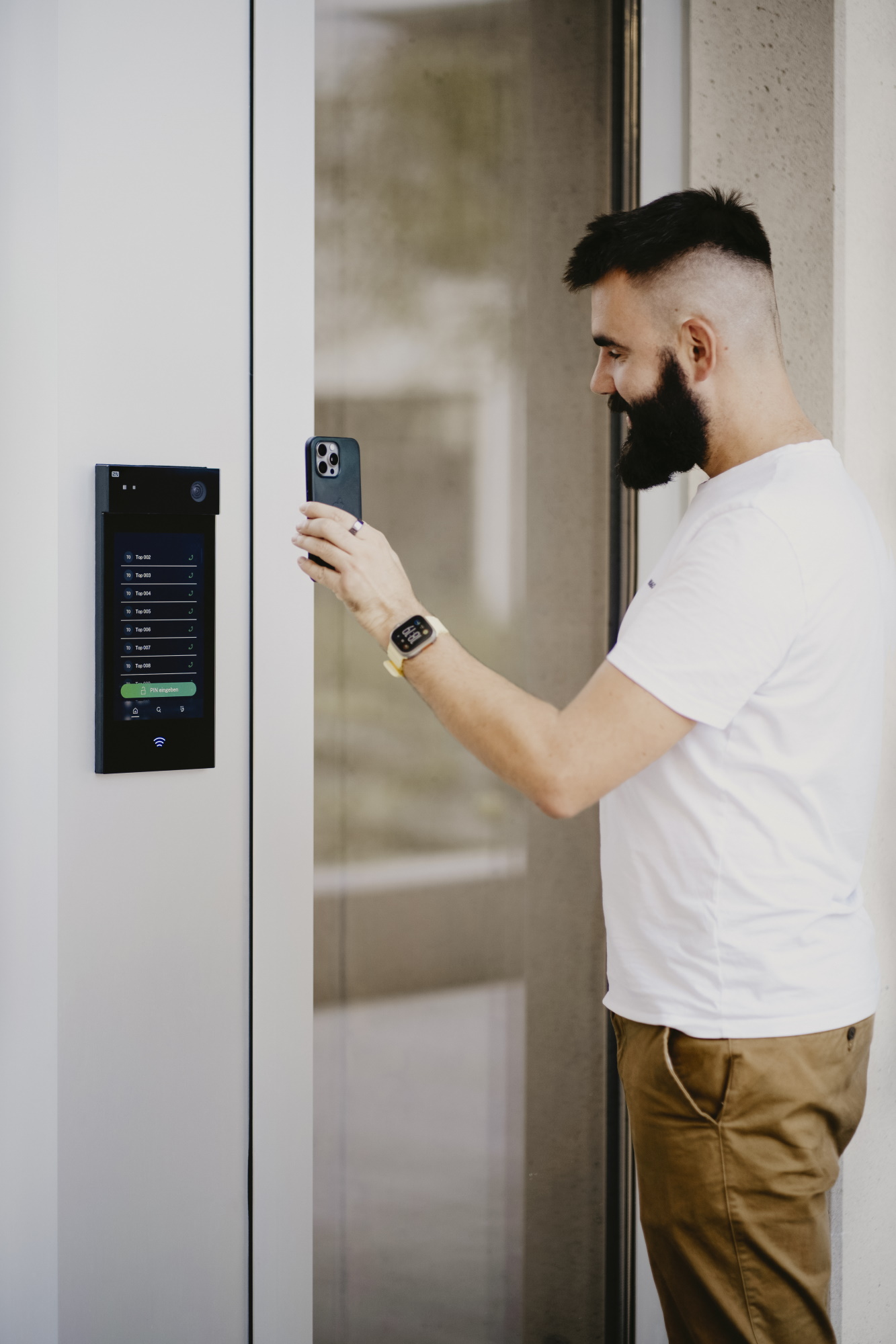 Der Zugang zu Gemeinschaftsbereichen wie der Dachterrasse oder dem Wellness-Bereich wird über eine App von der Firma Pockethouse geregelt. Nach der Reservierung erhalten die Nutzer*innen einen PIN-Code, mit dem sie sich an den 2N-Zutrittspunkten im Gebäude authentifizieren können.