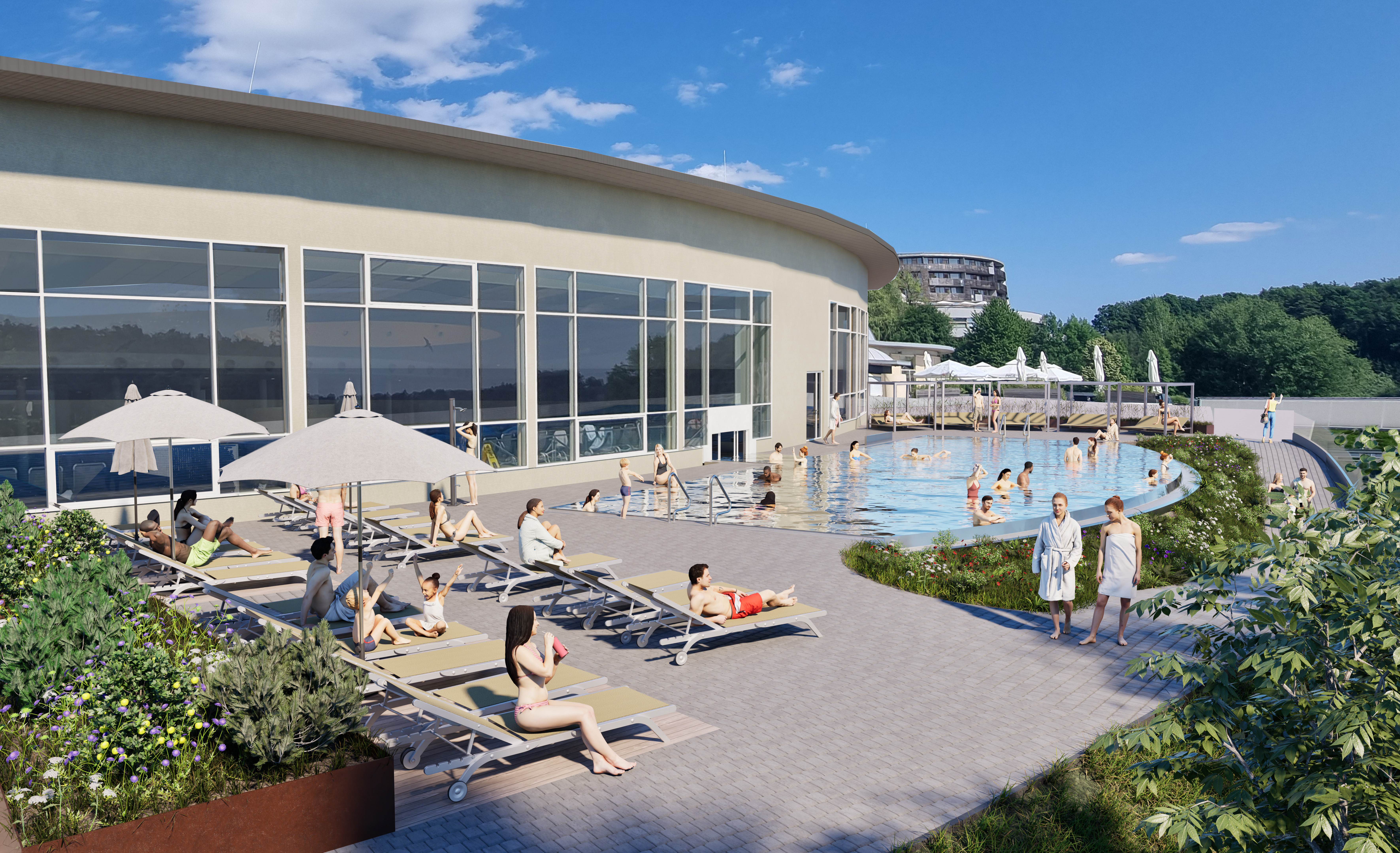 Mit der Neugestaltung des Außenbereichs hat man sich gleich eine bedeutsame Aufgabe vorgenommen: Edelstahl-Infinity-Bauweise, höchste technische Funktionalität, zeitgemäß in Design und – sehr wichtig – auch hinsichtlich der Betriebsstandards zeigen, wohin die Entwicklung des Resorts steuert: „Gemeinsam mit dem Planungsbüro DMB Bauconsult und Konstruktiva Bau als Baumeister setzen wir mit dem neuen Außenbereich ein starkes, richtungsweisendes Zeichen für die Zukunft des Allegria Resorts Stegersbach“, erläutert Marcel Pomper das Bauvorhaben. Und auch der angesprochene Gästekomfort wird nichts zu wünschen übriglassen: „Der neue Pool wird in seinen Dimensionen mit dem alten vergleichbar sein, er ist geeignet für Schwimmer und Nichtschwimmer, bekommt Liegen im Wasser, Whirlpooldüsen, es wird Massageliegen geben und eine beeindruckende Infinity-Poolkante.“ Ein echtes Thermenerlebnis eben.