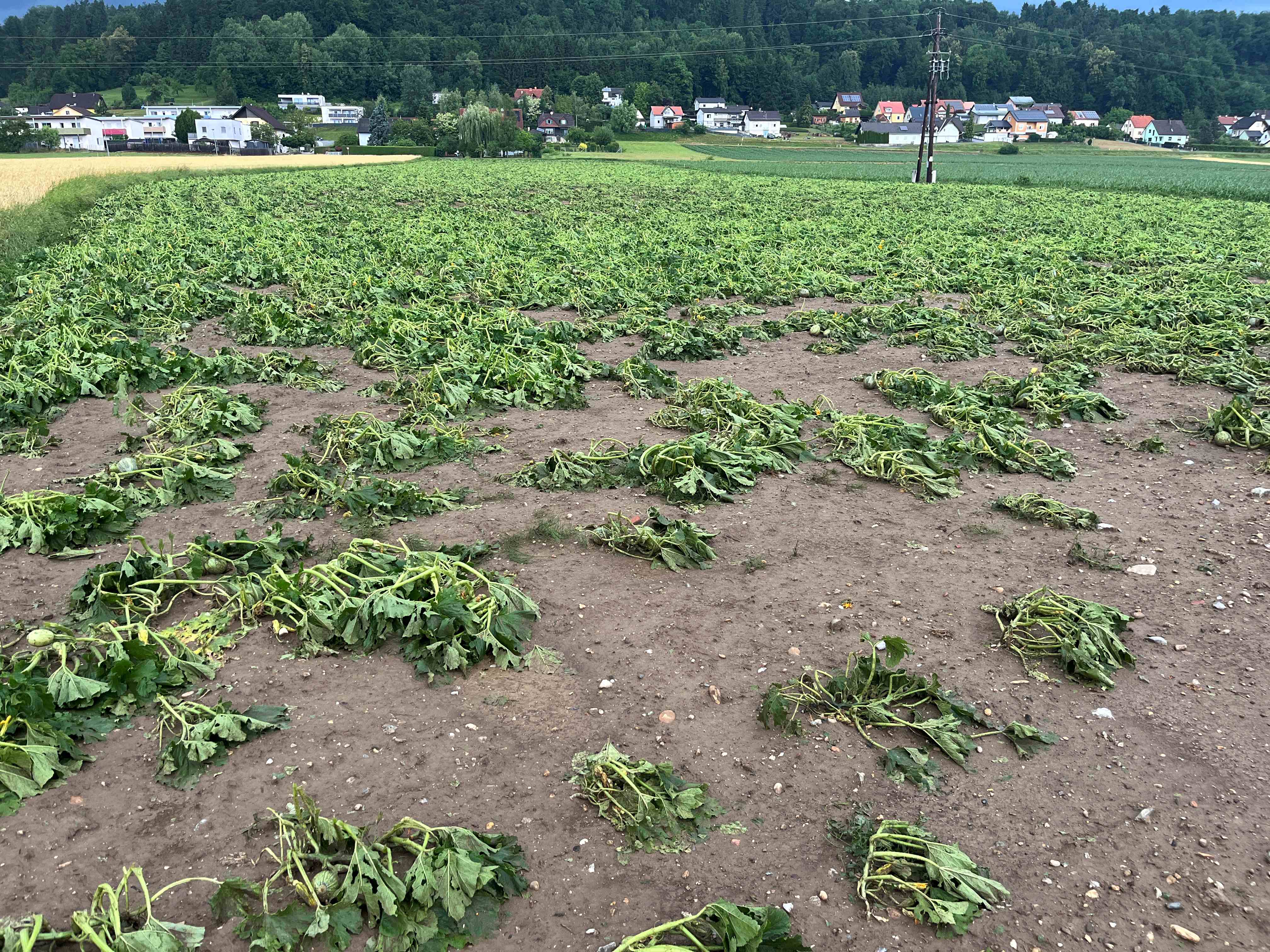 Binnen kürzester Zeit verursachten massive Hagelkörner – lokal mit einem Durchmesser von bis zu fünf Zentimetern – gravierende Schäden an landwirtschaftlichen Kulturen. Betroffen sind neben Acker- und Grünlandflächen auch Obst- und Baumschulen, Christbaumkulturen sowie Gemüseanbaugebiete.
