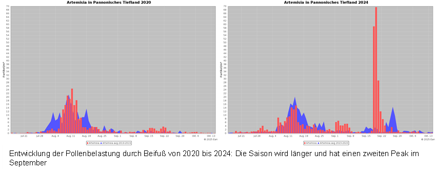 Der Pollenflug des Korbblütlers unterliegt kaum Schwankungen. „Die Saison verläuft jedes Jahr wie ein Uhrwerk: Sie startet Anfang Juli und Mitte August gibt es einen ersten Peak“, erklärt Dr. Markus Berger, Leiter des Österreichischen Polleninformationsdienstes. „Die Klimaerwärmung hat keinen Einfluss auf Startdatum und Belastungsgipfel, weil die Pflanze nicht auf Temperatur, sondern auf Lichtwellenlänge reagiert – die sich nicht verändert.“ Sehr wohl aber hat sie Auswirkungen auf die Dauer der Saison. „Inzwischen geht der Pollenflug bis weit in den Oktober hinein mit einem zweiten Belastungsgipfel Mitte September.“