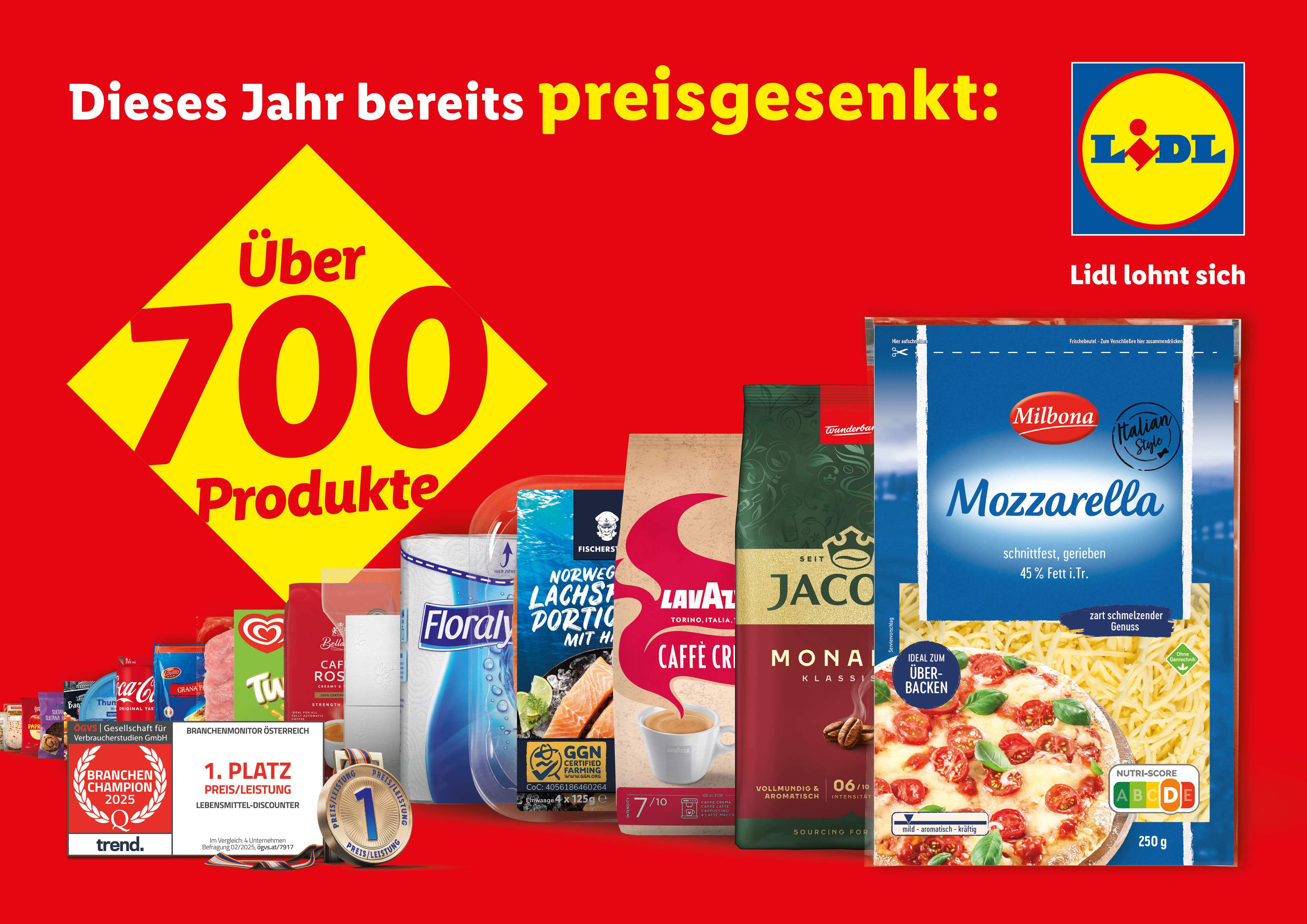 Seit Anfang des Jahres hat Lidl Österreich die Preise bei über 700 Einzelartikeln gesenkt – und zwar quer durch das Sortiment! Mit spürbarer Entlastung für die Konsumenten: Laut AK Preismonitor kostete der Einkaufskorb im Juni 2025 in den Supermärkten um durchschnittlich 10,2 Prozent mehr als bei den Diskontern.