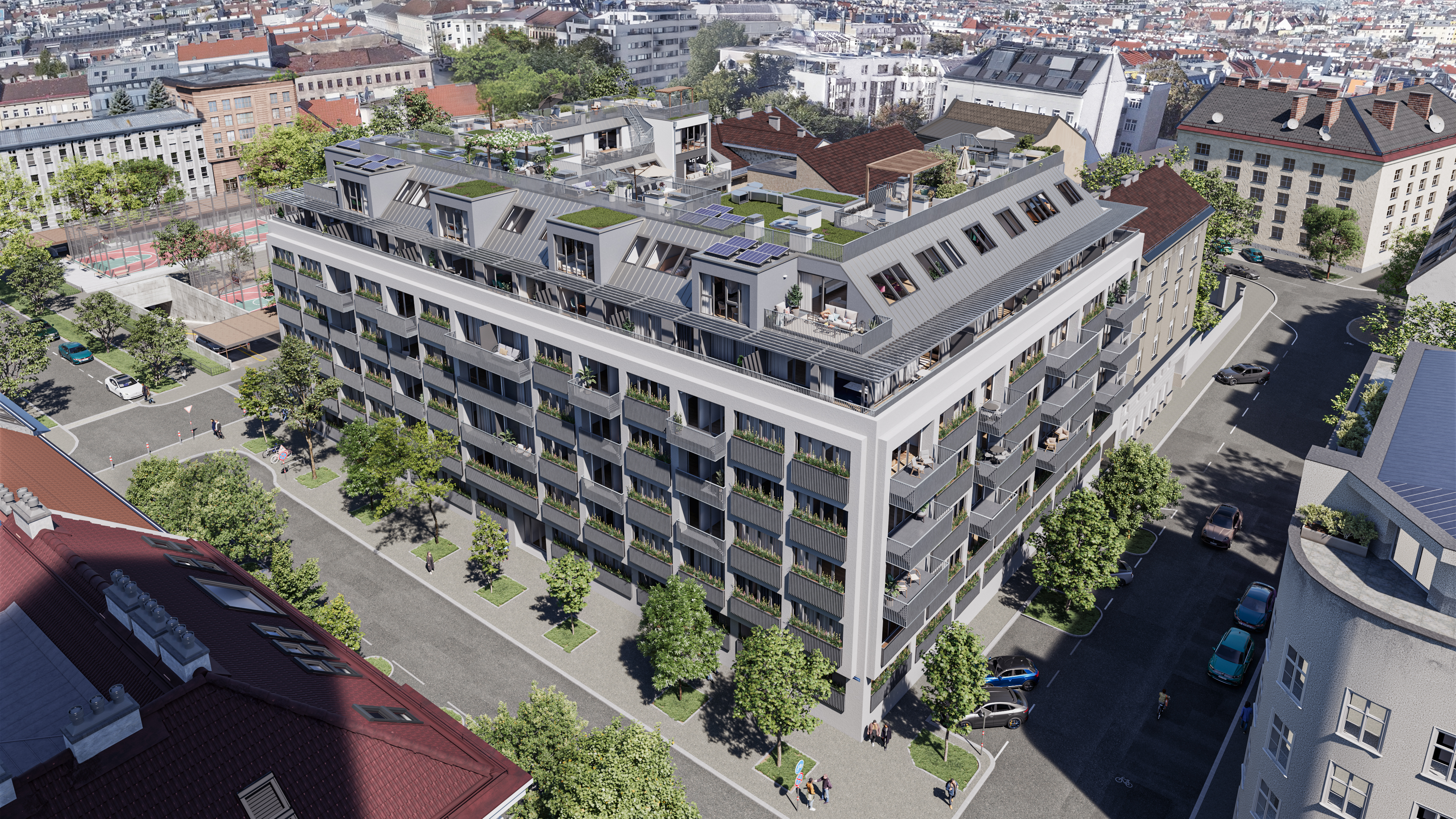 Private Freiflächen – darunter Gärten, Balkone, Loggien und beeindruckende Panorama-Dachterrassen mit 360°-Blick über Wien – machen jede Einheit zu einer urbanen Rückzugsoase. Ergänzt wird das Angebot durch einen begrünten Innenhof, einen Kinderspielplatz, einen Jugendspielraum sowie einen voll ausgestatteten Gemeinschaftsraum – ideale Voraussetzungen für modernes Wohnen und ein lebendiges nachbarschaftliches Miteinander.