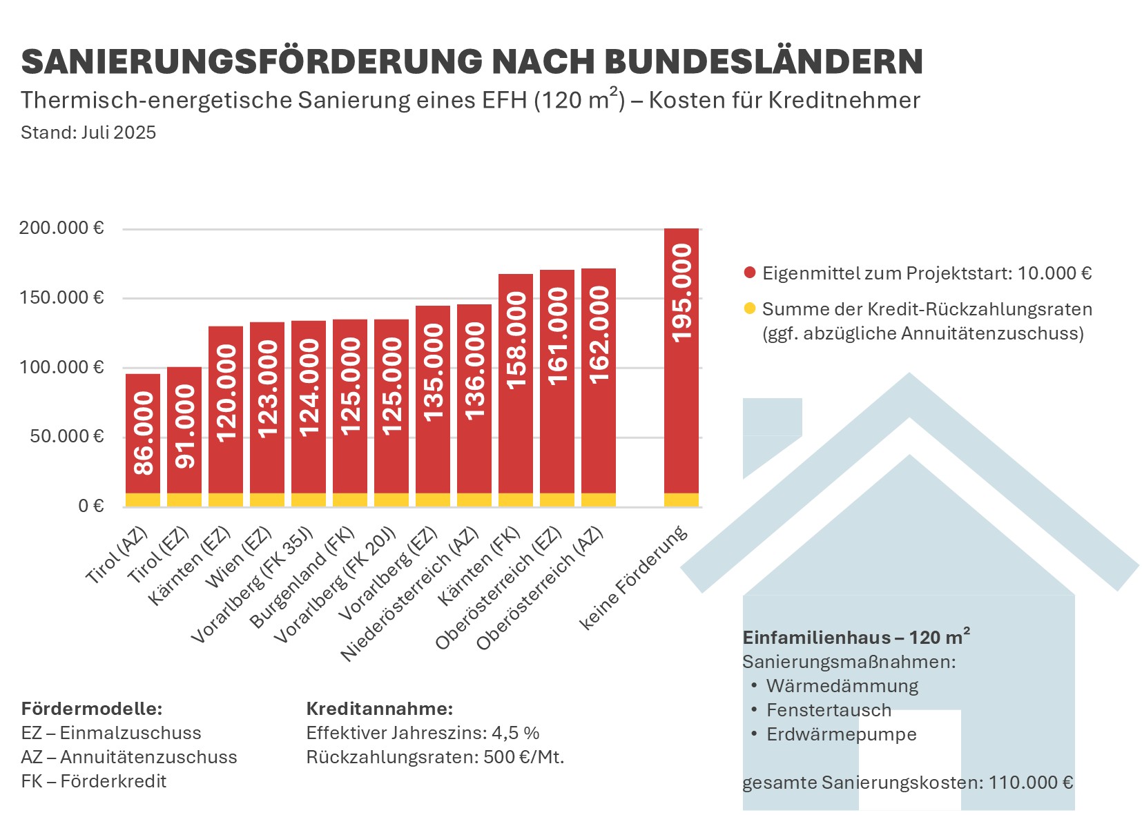 Bei Kreditfinanzierung können sich die Gesamtkosten durch Länderförderungen je nach Region um bis zu 109.000 Euro reduzieren. So belaufen sich die effektiven Aufwendungen etwa in Tirol auf rund 86.000 Euro, in Oberösterreich hingegen auf bis zu 162.000 Euro (statt 195.000 Euro ohne Förderung).