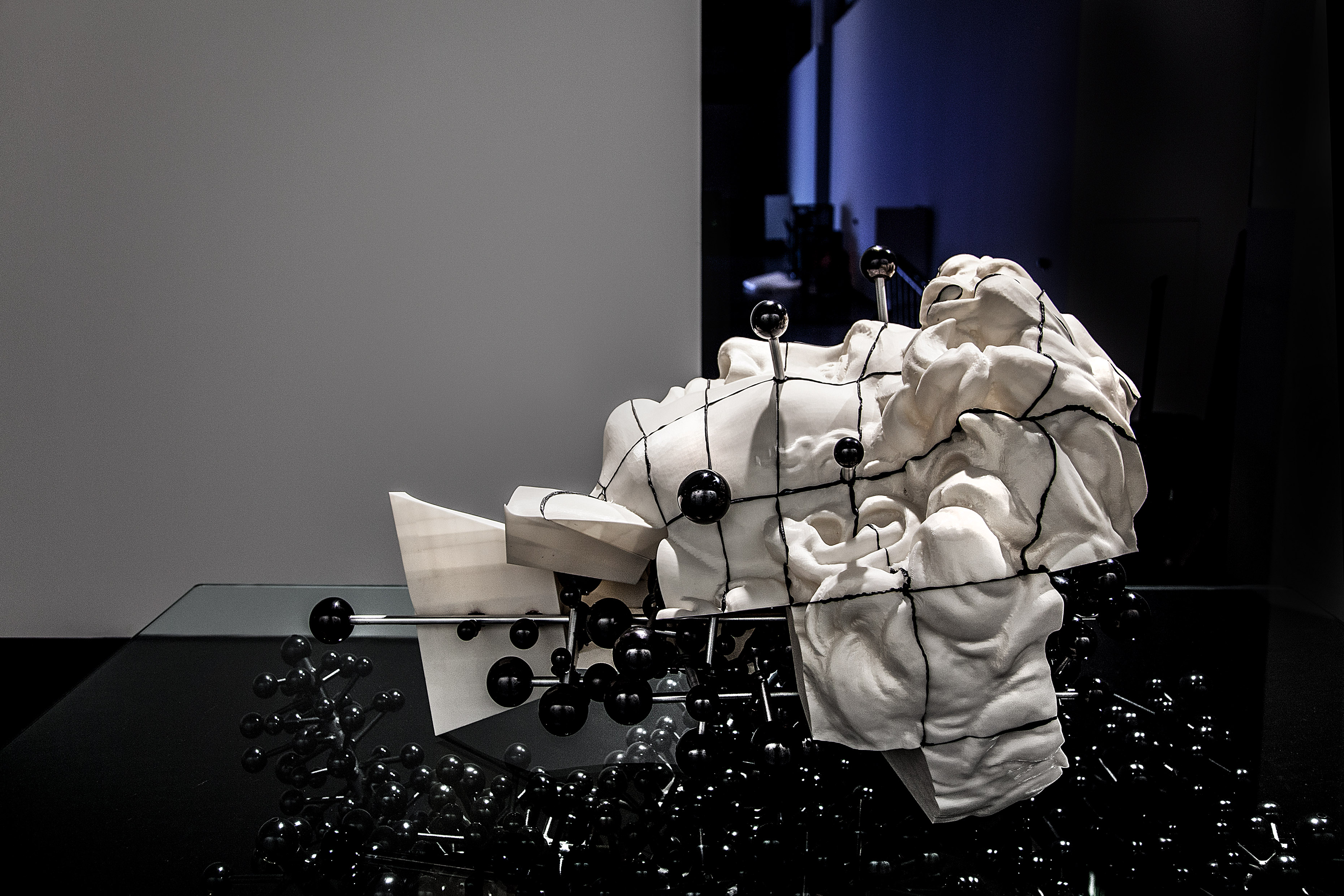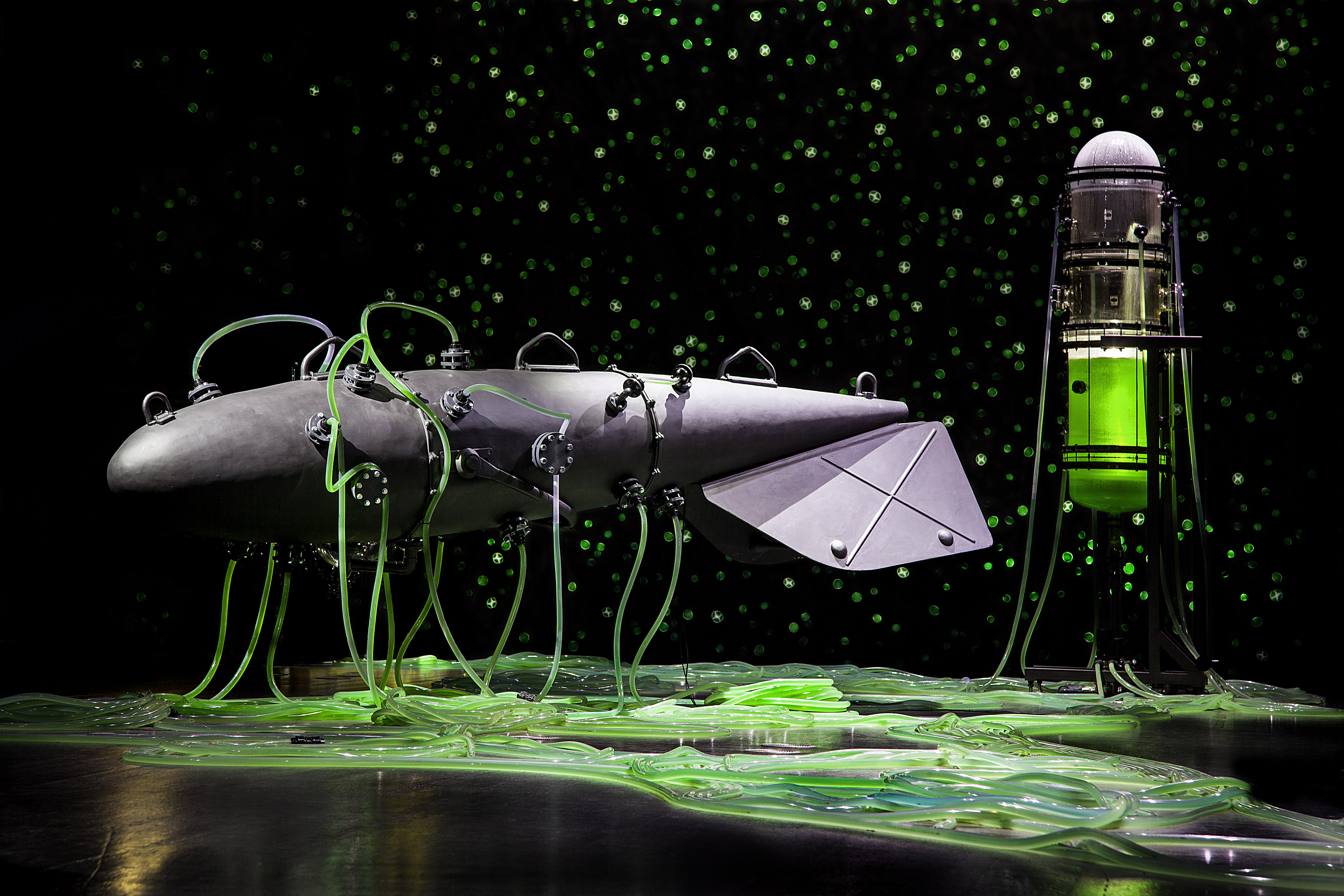 MS & MR MOL heißt das zweite Kapitel, bei dem spezifische Bakterien die Fettsäuren der Algen aus dem ersten Kapitel in PHB (Polyhydroxybutyrat) verwandeln – das ist ein biologisch hergestellter Kunststoff, der für die nächsten künstlerischen Schritte verwendet wird. Im dritten Kapitel RAFFINERIE wird PHB aus der bakteriellen Masse gewonnen und im vierten Kapitel der 3D-druckenden Maschine ANAKEL zugeführt. Dabei entstehen Skulpturen, die an natürliche Formen wie Stalagmiten erinnern.