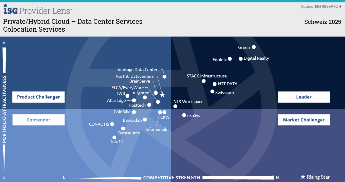 ISG, ein weltweit tätiges Technologieforschungs- und Beratungsunternehmen mit Schwerpunkt auf künstlicher Intelligenz, untersuchte in der heute publizierten, unabhängigen Studie "Private/Hybrid Cloud - Data Center Services 2025" den Schweizer Rechenzentrumsmarkt. Alle analysierten Anbieter wurden anhand eines mehrstufigen Bewertungsverfahrens beurteilt. Green erreichte erneut den Leader-Status und positioniert sich zum sechsten Mal in Folge an der Spitze beider Bewertungsdimensionen: Wettbewerbsstärke und Portfolioattraktivität.