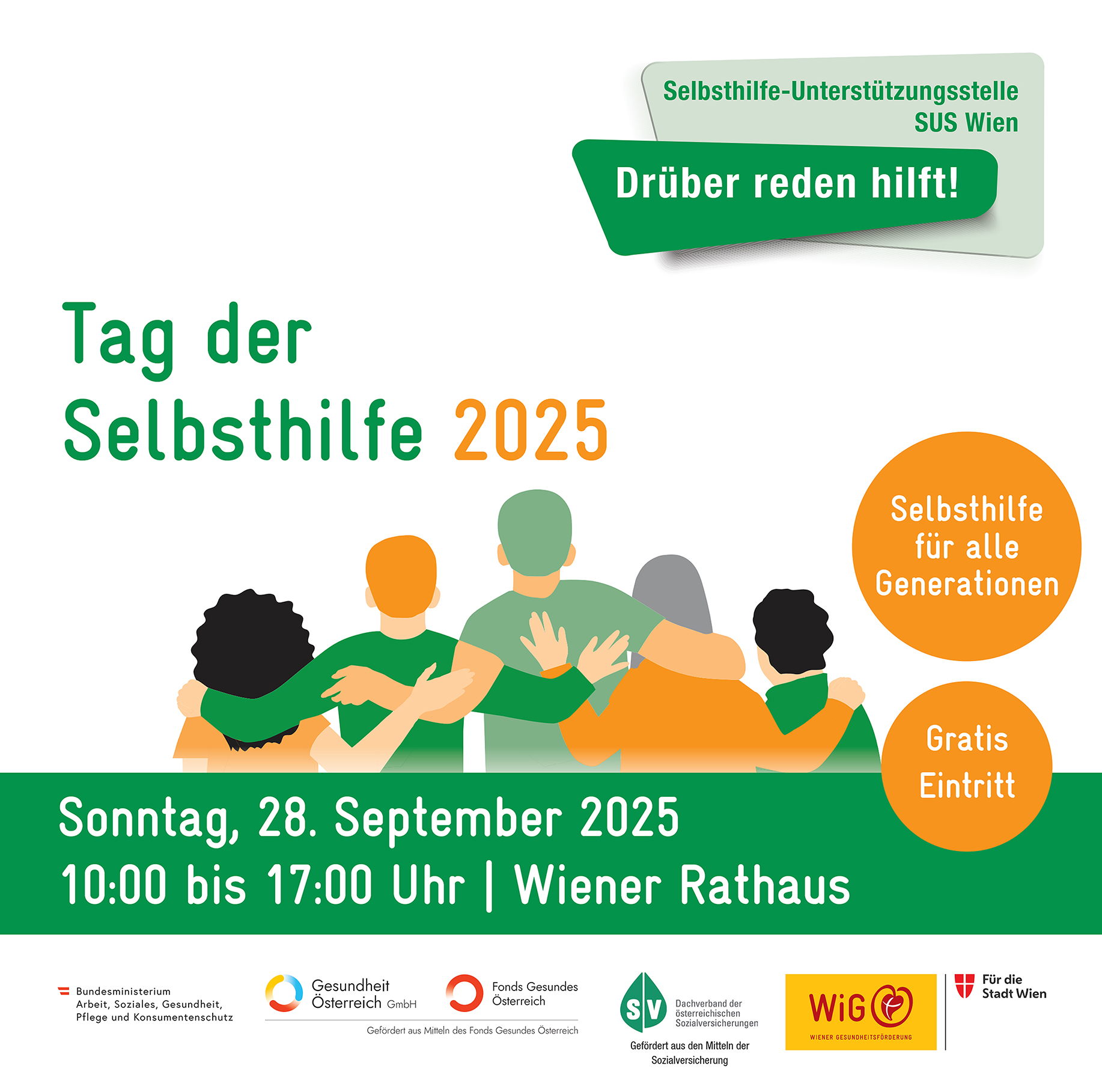 Die Selbsthilfe-Unterstützungsstelle SUS Wien in der Wiener Gesundheitsförderung – WiG ist erste Anlaufstelle zum Thema Selbsthilfe in Wien. Sie informiert und hilft bei der Suche nach Selbsthilfegruppen, berät bestehende Gruppen und unterstützt Gruppen in Gründung. Darüber hinaus organisiert die SUS Wien alle zwei Jahre den Tag der Selbsthilfe als Publikumsveranstaltung im Wiener Rathaus für alle Wiener*innen. Mehr dazu unter sus-wien.at