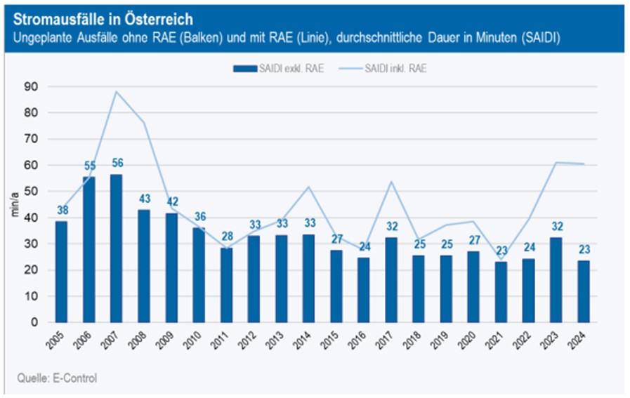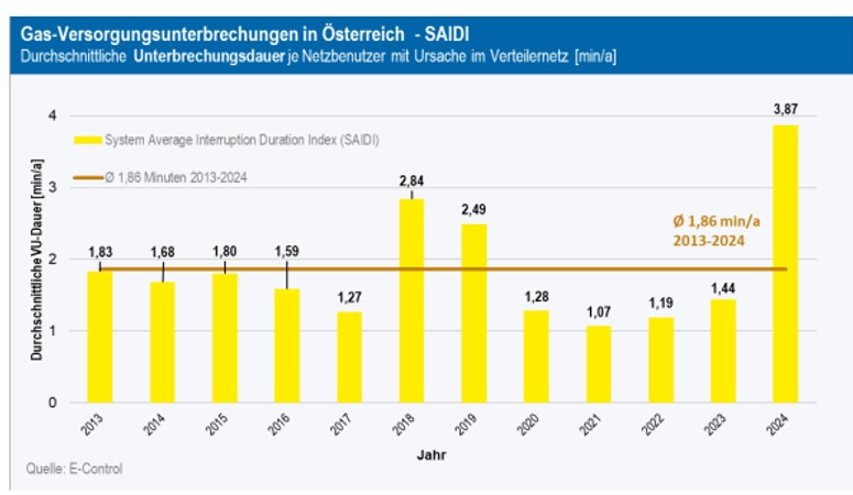 Österreicher:innen 2024 rd. 23 Minuten ohne Strom- und 3,9 Minuten ohne Gasversorgung bei ungeplanten Unterbrechungen (durch äußere Einflüsse, Anlagenausfälle od. andere Störungen)