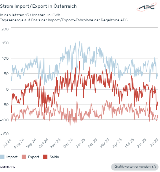 Per Saldo ergab sich über den Gesamtmonat Juli 2025 in Österreich (Regelzone APG*) ein Export in der Höhe von 458 GWh (auf Basis der Fahrpläne), wobei an 22 Tagen bilanziell Strom ins Ausland exportiert werden konnte. Auch im Vergleichsmonat des Vorjahres war Österreich Export-Land, wobei der Saldo mit 997 GWh damals höher ausfiel und an allen 31 Tagen des Monats ein bilanzieller Stromexport verzeichnet werden konnte.