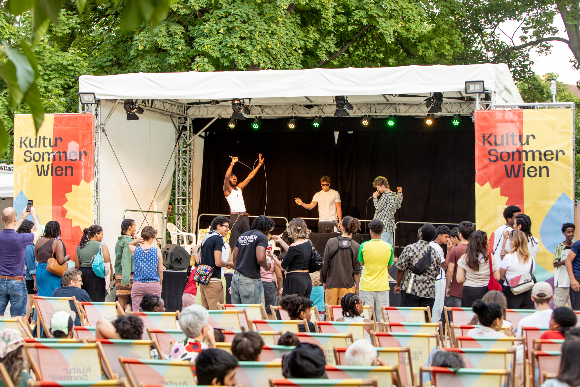 Zwischen Bühne und Liegestuhl entsteht beim Open-Air-Festival ein offener Raum für Dialog. „Der Kultursommer Wien verbindet Menschen, indem Kunst eine Brücke für Austausch und Begegnung verschiedener Lebenswelten schafft – das stärkt das Miteinander in unserer Stadt“, stellt Kulturstadträtin Veronica Kaup-Hasler fest. Besonders beim partizipativen Programm von Kultursommer Plus steht das Mitgestalten im Fokus. Die Devise lautet: Einfach vorbeikommen, um auszuprobieren, zu hinterfragen und neu zu denken – künstlerisch, gesellschaftlich und strukturell. Mitmachformate luden dazu ein, über Teilhabe zu diskutieren und zu erkunden, wie Kunst und Kultur als Werkzeug für Veränderung wirken können. Bei 29 Gartenkonzerten in den Häusern zum Leben schwelgten die Bewohner:innen bei Live-Musik in Erinnerungen und kamen mit Gästen von außerhalb in Kontakt – die Nachmittage wurden zum generationsübergreifenden Erlebnis direkt im eigenen Garten der Seniorenheime. Zusätzlich zu einem umfangreichen Kinderprogramm an ausgewählten Vormittagen fand jeden Samstag ein Kinderfest für Jung und Alt an einem anderen Festival-Standort statt.