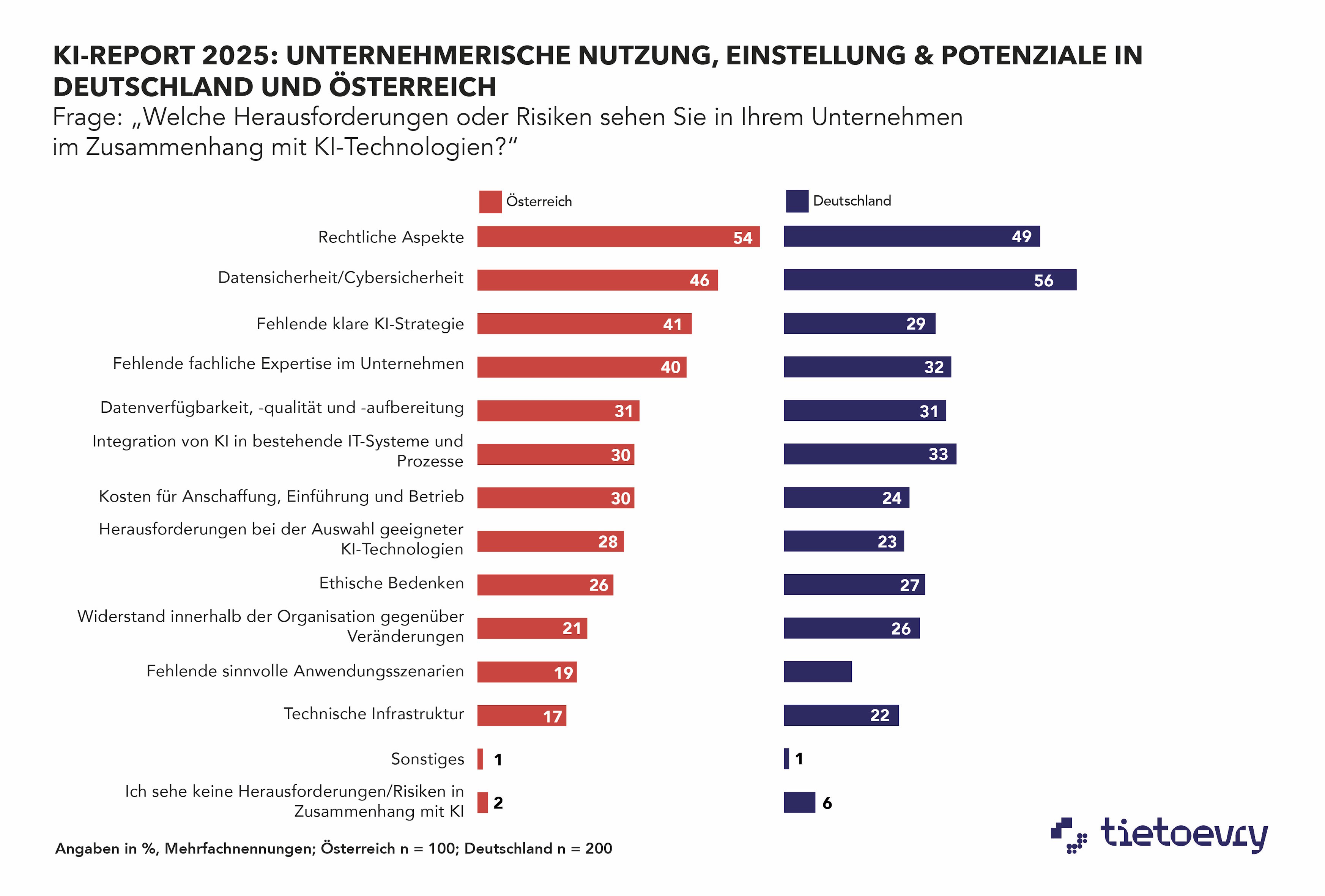 Darüber hinaus wird die strategische Lücke durch einen Mangel an internem Fachwissen und die unzulängliche Datenlage weiter vergrößert: Etwa ein Drittel der Befragten in Österreich (40 %) und Deutschland (32 %) empfindet fehlende fachliche Expertise im eigenen Unternehmen als wesentliches Risiko im Zusammenhang mit KI-Technologien. Ein weiteres Drittel (31 %) sieht die schlechte Verfügbarkeit und Qualität von Daten als Hemmnis. Obwohl sich mehr als die Hälfte der Führungskräfte selbst als gut und sicher im Umgang mit KI-Tools einstuft, reicht dies offenbar nicht aus, um die strategische Implementierung auf Organisationsebene voranzutreiben.