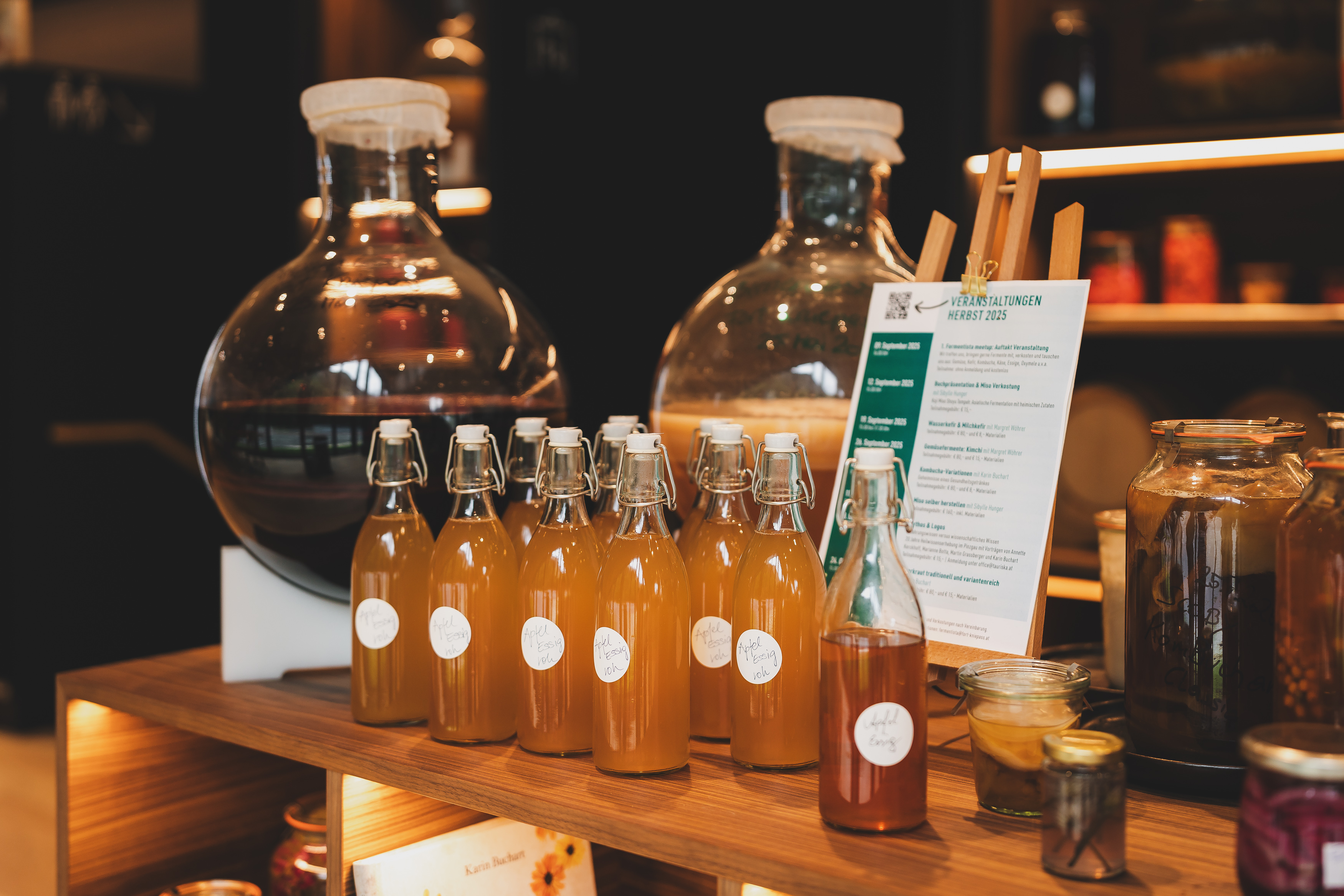 Zudem können Besucher:innen hochwertige, hausgemachte Fermente direkt vor Ort erwerben – darunter Scobys für Kombucha, Wasserkefir-Kulturen, Starterkulturen für Sauerteig, sowie fertige Produkte wie Oxymele, fermentierte Gemüse, Kräuteressige oder Kombucha aus regionalen Zutaten.