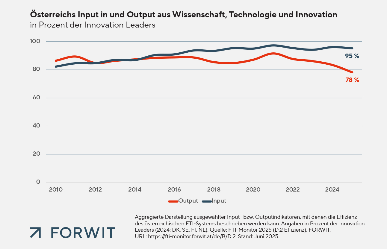 Die längste Rezession der zweiten Republik, der Abstieg im European Innovation Scoreboard von Platz 6 auf 8 und der Absturz im IMD Competitiveness Index von Rang 16 (2020) auf nunmehr 26 sind Signale, die ernstgenommen werden müssen und zum raschen und gezielten Handeln aufrufen. „Österreichs Investitionen in Forschung und Innovation liegen im europäischen Spitzenfeld. Der finanzielle Input erzeugt aber nicht den erwarteten Output. Wir sehen diese Entwicklung seit Jahren – nicht zuletzt im FTI-Monitor: Österreich erreicht mit dem annähernd gleichen Input wie die Innovation Leaders signifikant weniger Output. Hier liegt viel Potenzial brach, das freigesetzt werden muss