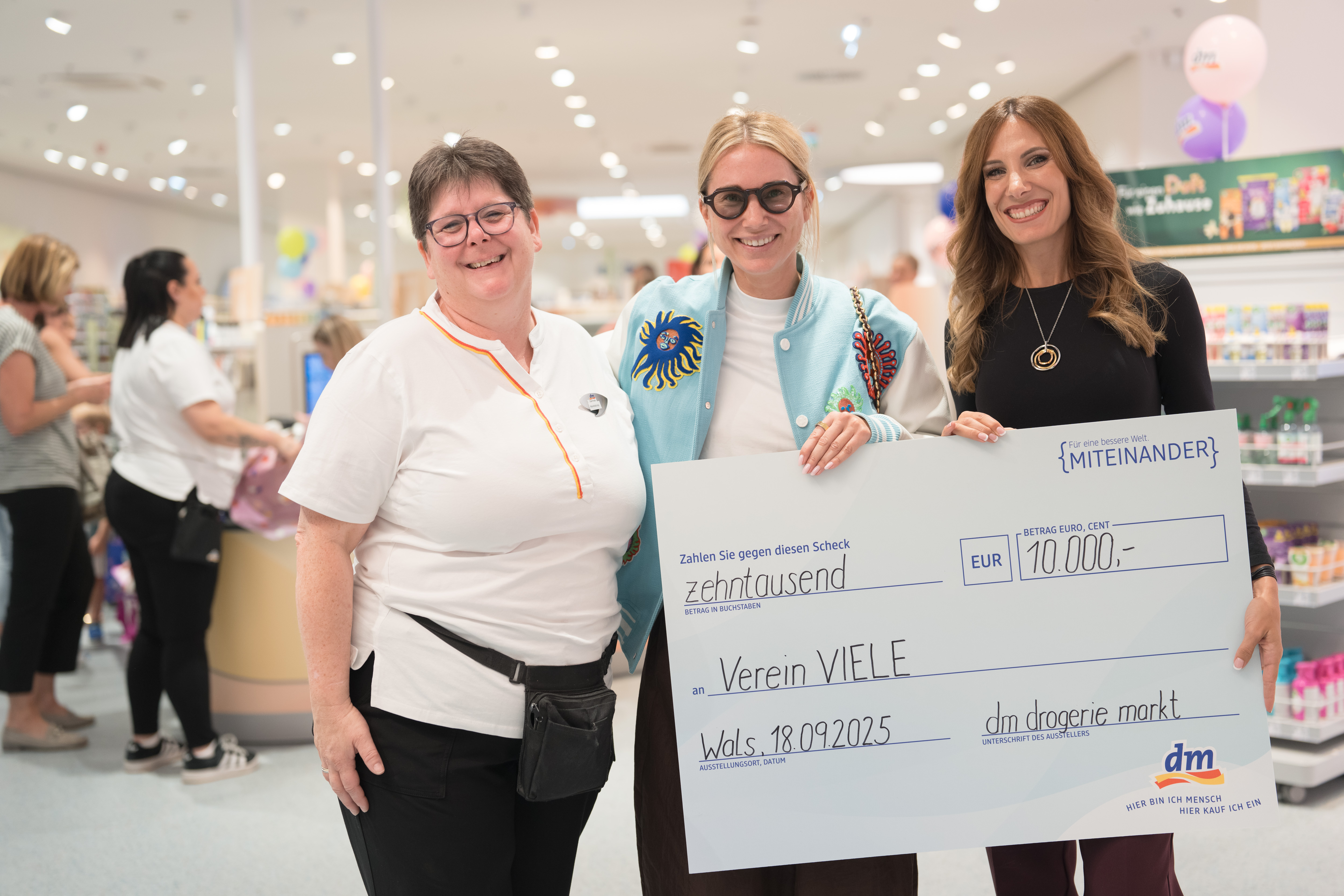 Eine Stunde lang wurde am 18. September, dem Eröffnungstag der neuen Walser Filiale, für den guten Zweck kassiert. Der Umsatz der Kassieraktion wurde von dm nochmal deutlich erhöht und auf insgesamt 10.000 Euro aufgestockt. Die Spende kommt nun den Projekten des Verein VIELE zugute. Der Salzburger Verein bietet Frauen und ihren Kindern Schutz und Unterstützung in schwierigen Lebenssituationen. Neben der Betreuung in Schutzunterkünften stehen Beratung, Gewaltprävention, Bildungsangebote und Integrationsprogramme im Mittelpunkt. Alle Angebote sind kostenlos, vertraulich und mehrsprachig und haben das Ziel, Frauen Sicherheit zu geben, ihre Eigenständigkeit zu stärken und gesellschaftliche Teilhabe zu ermöglichen.
