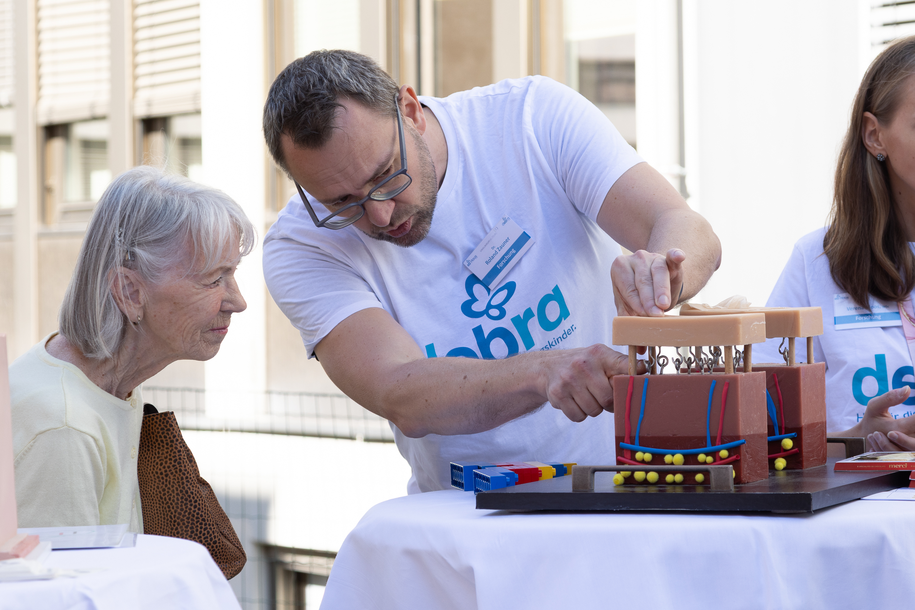 Das multidisziplinäre Team aus Ambulanz, Forschung, Studienzentrum und Akademie präsentierte die vielfältigen Tätigkeiten rund um die Versorgung von Menschen mit Epidermolysis bullosa (EB). Anhand interaktiver Stationen wurde eindrucksvoll gezeigt, wie in dieser weltweit einzigartigen Einrichtung geforscht, therapiert und unterstützt wird. Besonders beliebt waren die Mitmach-Stationen: Hier konnten BesucherInnen spielerisch nachvollziehen, wie die Haut aufgebaut ist, warum EB entsteht und welche Rolle die Gentherapie zukünftig spielen könnte. Mit Schokolade als anschaulichem Hilfsmittel erklärten ForscherInnen die Grundlagen der Vererbungslehre und begeisterten damit Jung und Alt.