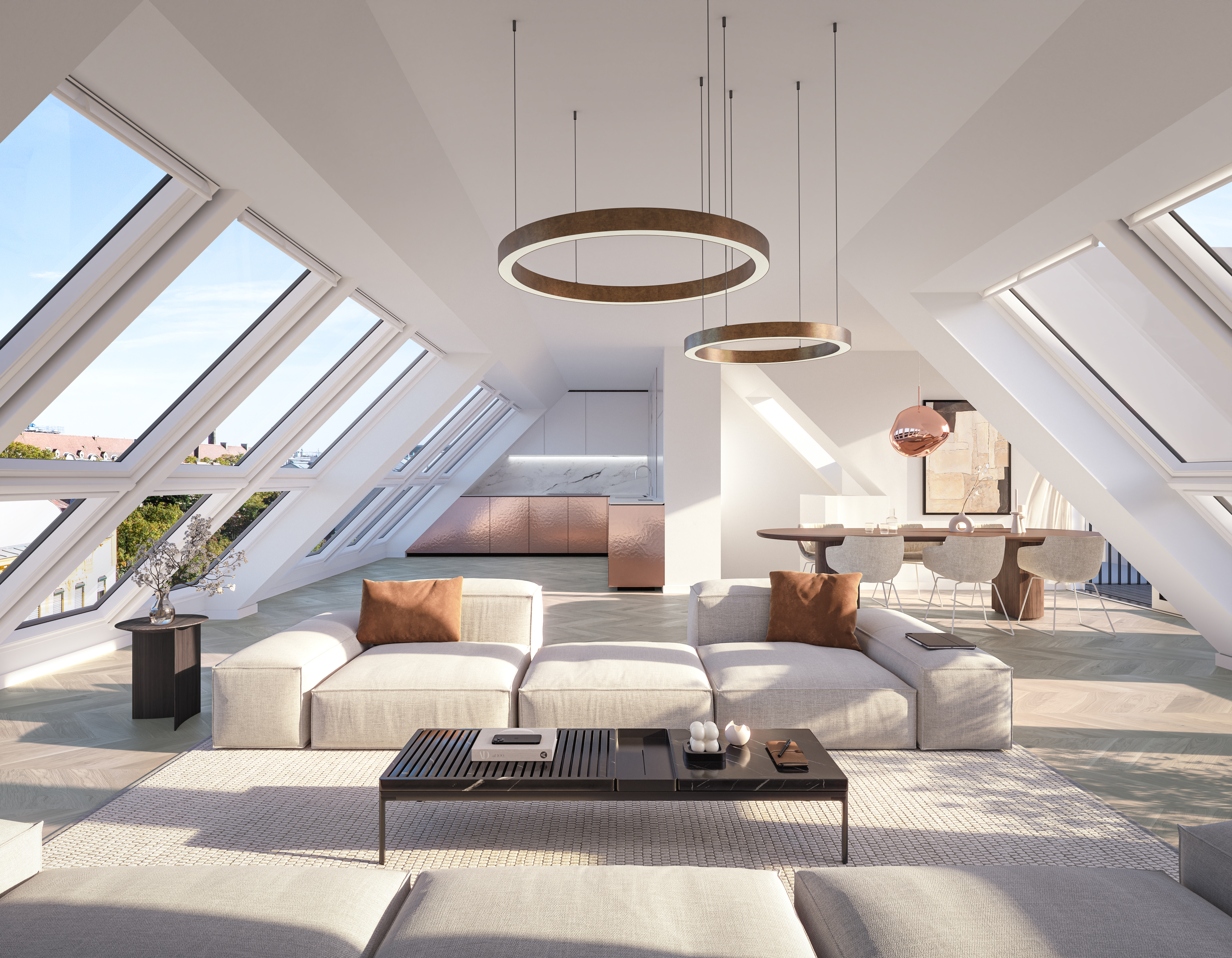 Mit dem Ausbau der Dachflächen entstehen zusätzliche, hochwertige Wohneinheiten – ausgestattet mit Fischgrätparkett, großzügigen Fensterfronten, Balkonen und Terrassen. Insgesamt werden 36 exklusive Eigentumswohnungen mit Größen von 36 bis 185 m² realisiert, ergänzt durch hofseitige Freiflächen, Dachterrassen und zwei seltene Gartenwohnungen im Parterre.