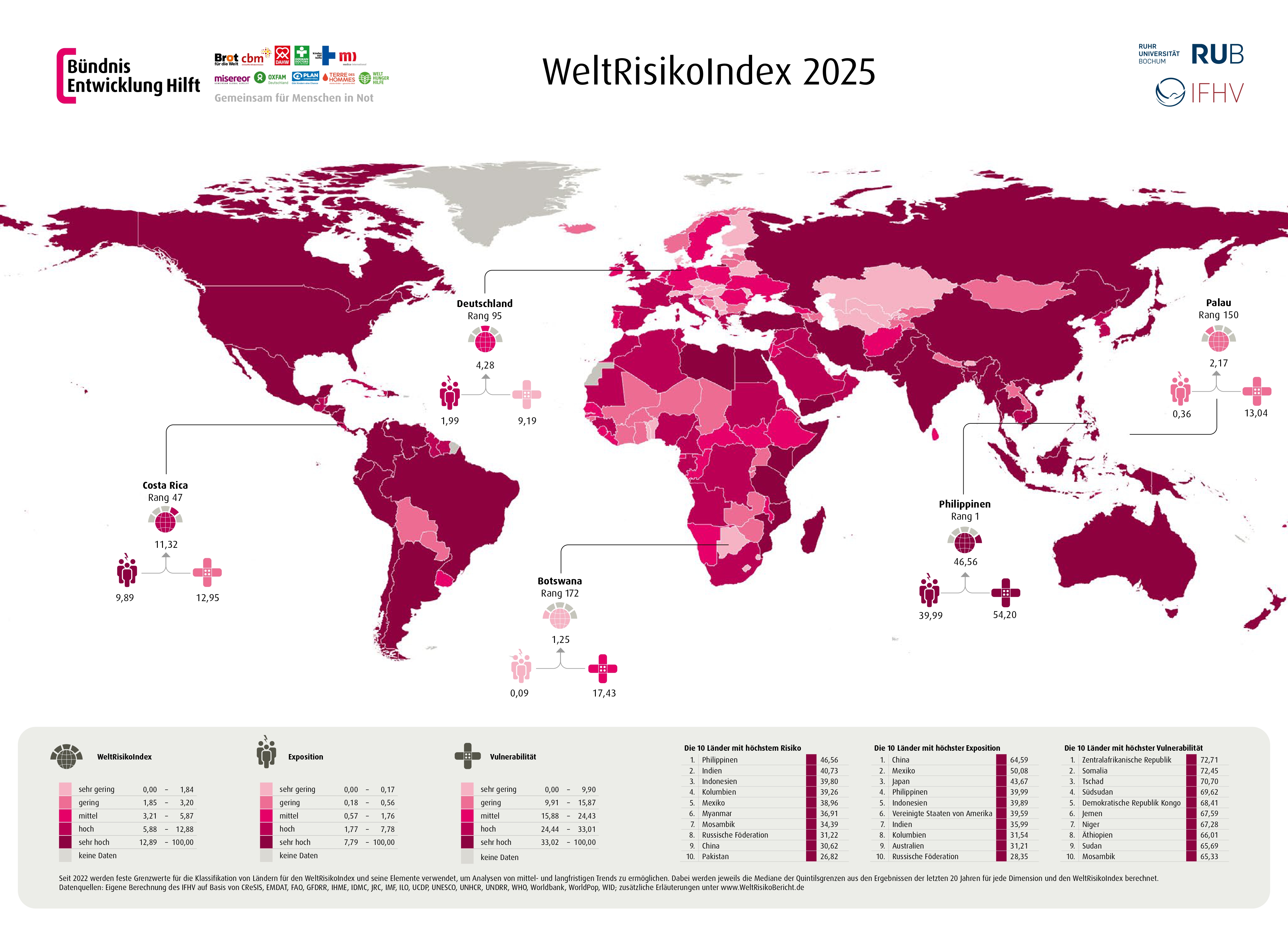 Philippinen erneut Risikospitzenreiter Der aktuelle WeltRisikoIndex bewertet das Katastrophenrisiko von allen 193 UN-Mitgliedsstaaten. Auch 2025 liegen die globalen Risikohotspots in Asien und Lateinamerika. Deutschland liegt wie im Vorjahr im globalen Mittelfeld.