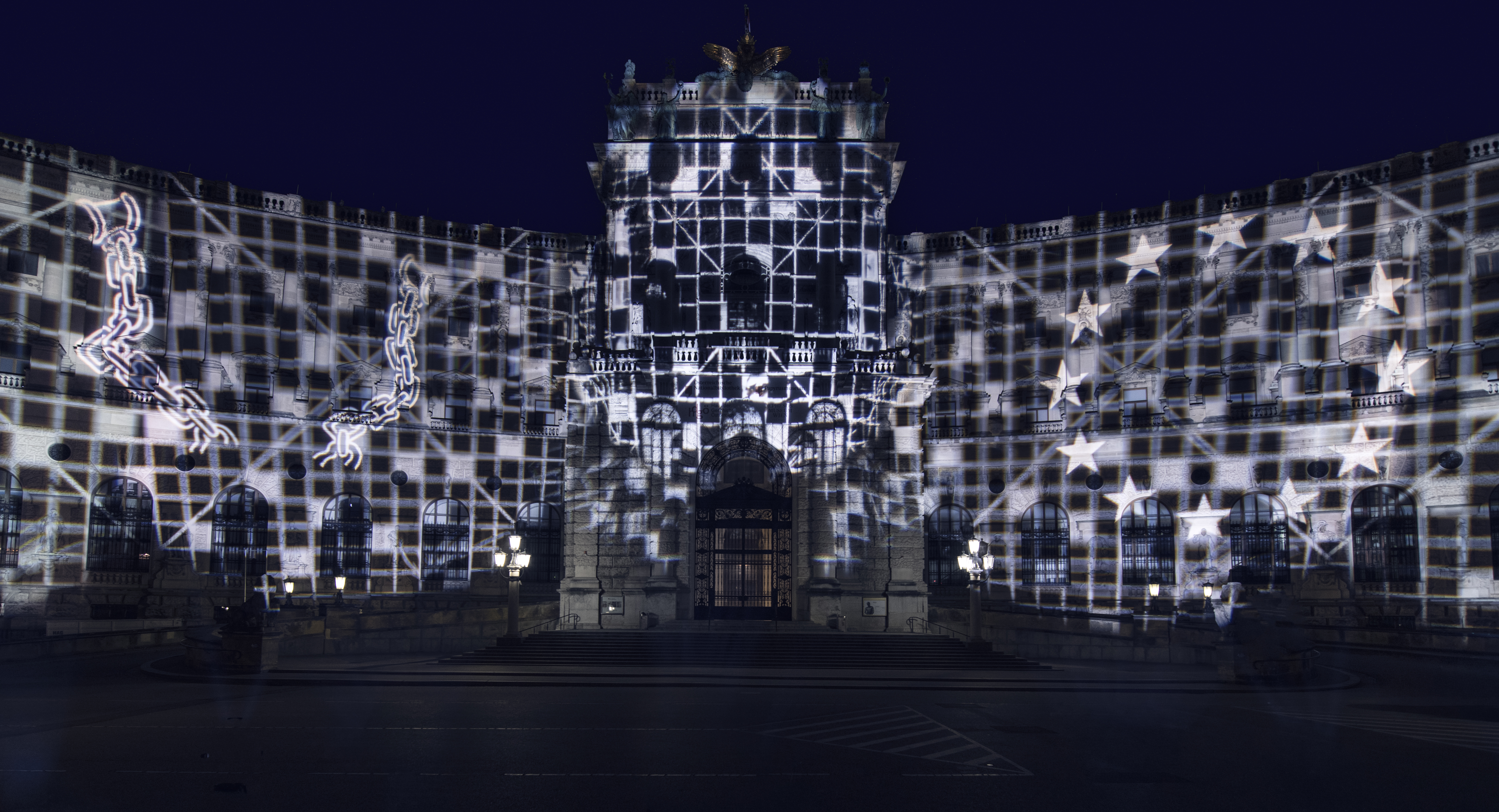 In diesem Sinne ist die nächtliche Transformation der Neuen Burg mit drei kraftvollen Symbolen, die in hellem Licht- und Schattenraster erstrahlen, das zentrale Element der künstlerischen Intervention: