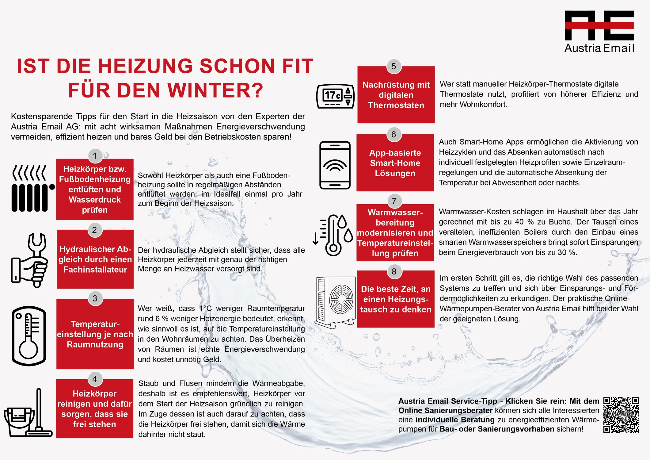 8 Tipps vom Team der Austria Email AG, um das Heizungssystem fit für die neue Saison zu machen und gleichzeitig bares Geld bei den Betriebskosten zu sparen: