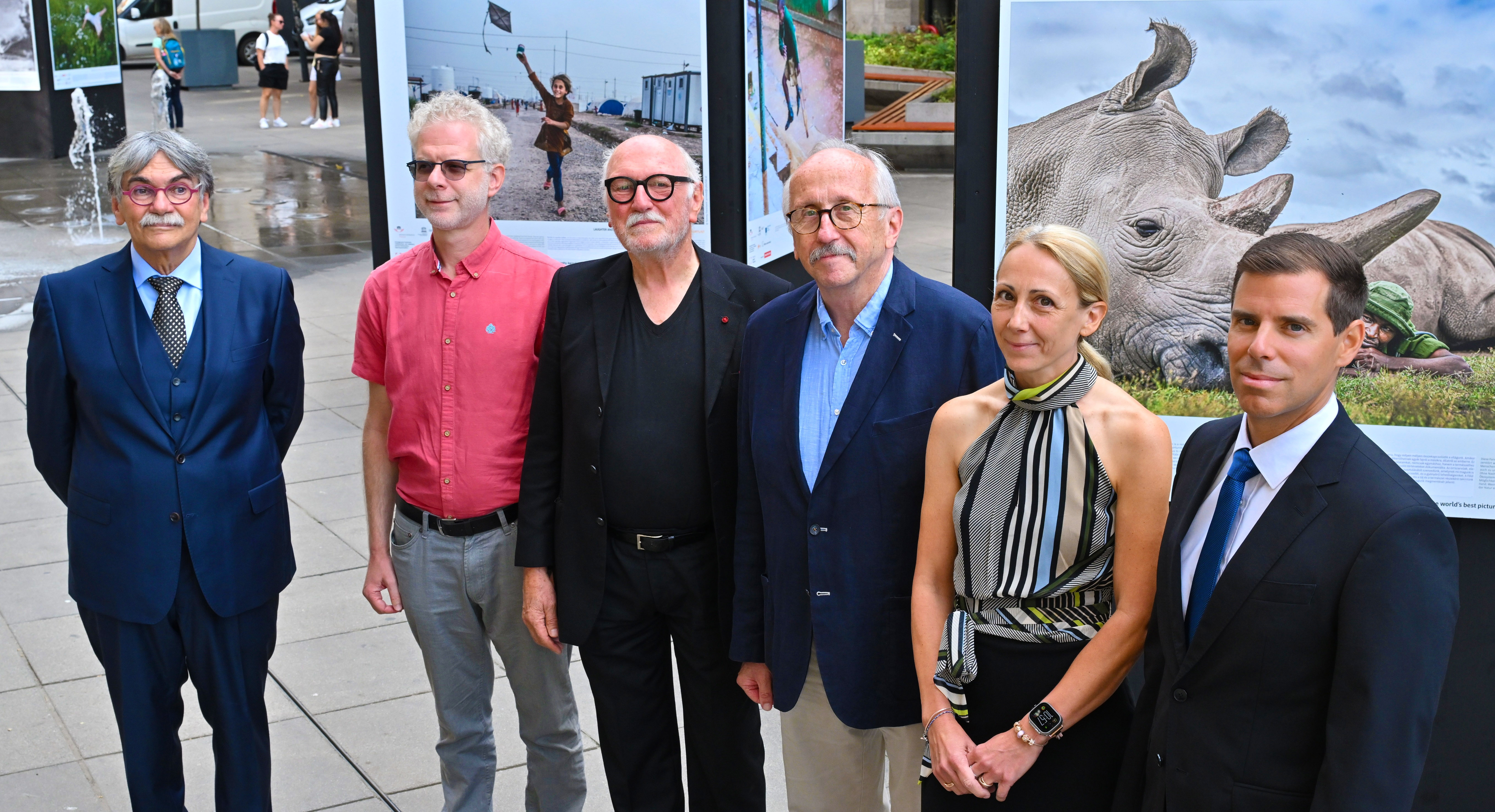 An der Eröffnung der Ausstellung nahmen teil (Am Foto von links nach rechts): András Török, Manager des Gemeinschafts-Fotoarchivs Fortepan, Máté Gáspár, Direktor des Örkény-Theaters, Lois Lammerhuber, Direktor des Festivals La Gacilly-Baden Photo und Mitbegründer des Global Peace Photo Award, Péter Niedermüller, Bürgermeister von Erzsébetváros, Orsolya Csépai, stellvertretende Generaldirektorin der Alfa Biztosító, und Gábor Havas, Vorsitzender und Generaldirektor der UNION Biztosító.