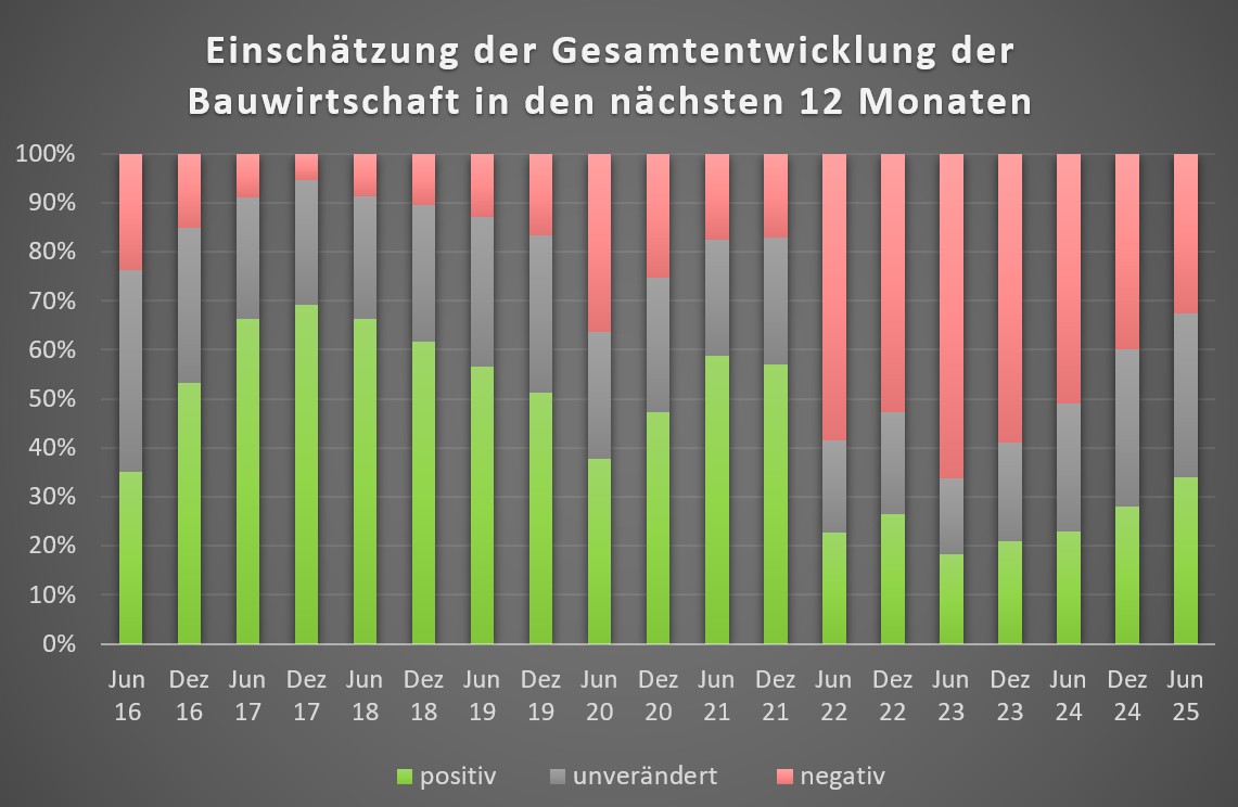 Unter anhaltend schwierigen Rahmenbedingungen ist Österreichs Bauwirtschaft in das Jahr 2025 gestartet. Nach dem letzten massiven Stimmungseinbruch im Jahr 2023 zeichnet sich aber ein stabiler Aufwärtstrend ab. Zu Jahresmitte 2023 rechneten knapp über 66 Prozent der befragten Unternehmen mit einer rückläufigen Gesamtentwicklung der Bauwirtschaft in den nächsten zwölf Monaten, im Sommer 2024 waren es 51 Prozent, aktuell sind es nur noch rund 33 Prozent. Die Zahl jener, die von einer positiven Gesamtentwicklung ausgehen, ist seit der letzten Befragung zu Jahresmitte um 10 Prozent, von 23 Prozent auf 33,8 Prozent, gestiegen. Ebenfalls ein Drittel der Unternehmen erwartet eine unveränderte, also leicht positive Entwicklung der Bauwirtschaft bis zum Sommer 2026.
