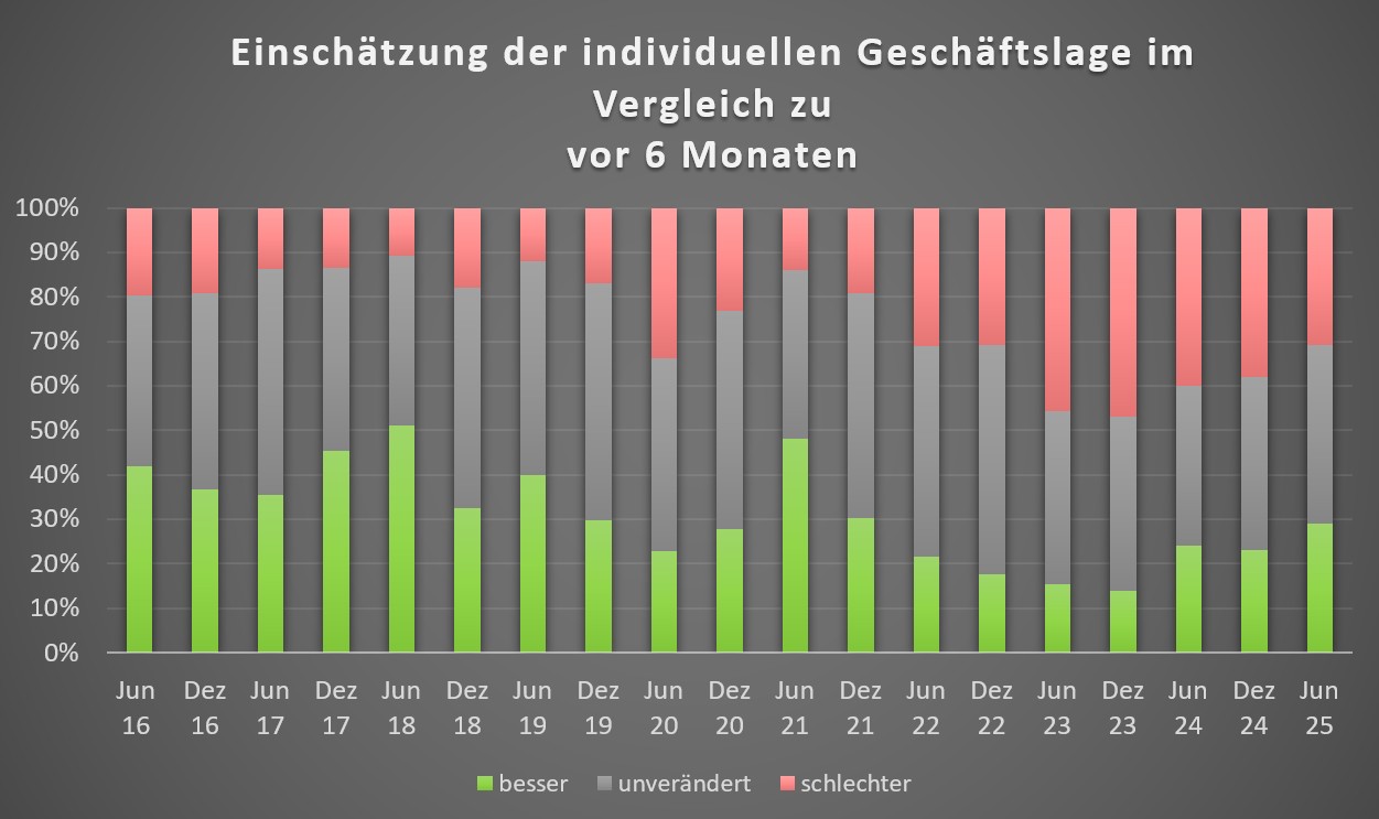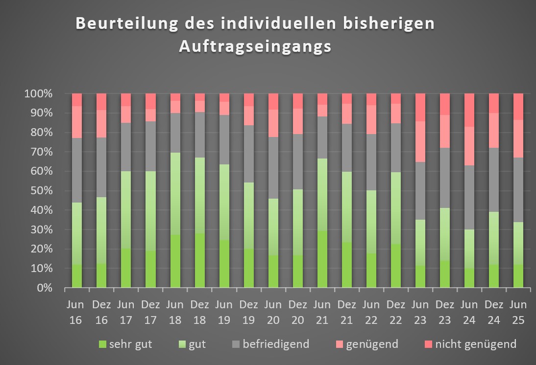 Die Talsohle scheint offensichtlich durchschritten, das belegen auch die Auftragseingänge für die zweite Jahreshälfte 2025. Mehr als zwei Drittel der Unternehmen (66,9 Prozent) spricht von einer „sehr guten“, „guten“ oder zumindest „befriedigenden“ Auftragslage, das entspricht in etwa den Zahlen der Umfrage vor einem Jahr, die bereits ein positives Bild zeichneten. Zu Jahresmitte 2024 zeigten sich 63 Prozent durchwegs zufrieden mit der Auftragslage. Die Zahl jener, denen es an Auftragseingängen für die zweite Jahreshälfte mangelt, ging leicht zurück, von 37 Prozent in 2024 auf aktuell 32,9 Prozent. Das sind immer noch knapp ein Drittel der Unternehmen, weist aber darauf hin, dass der Abwärtstrend gestoppt ist.