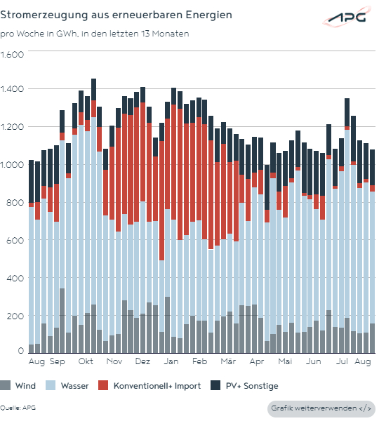 Während der Anteil der Stromproduktion aus PV-Anlagen um 2,0 Prozent (750 GWh Produktion) zurückging, erhöhten sich die Anteile sowohl der Wasserkraft als auch der Windenergie: Der Anteil der Wasserkraft erhöhte sich leicht um 0,7 Prozent (3.145 GWh Produktion); jener der Windenergie legte um 1,8 Prozent zu (489 GWh Produktion). Erneuerbare Energiequellen bildeten im August etwa 94,0 Prozent der Gesamteinspeisung.
