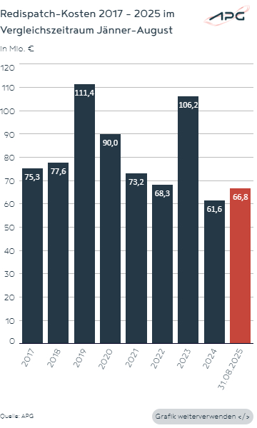Insgesamt waren bisher an 125 Tagen (Vergleich: 123 Tage bis Ende August im Jahr 2024) Eingriffe notwendig. Durch diese Redispatch-Maßnahmen entstanden bis Ende August 2025 Kosten in der Höhe von 66,8 Millionen Euro (plus 5,2 Millionen zum Vorjahres-August).