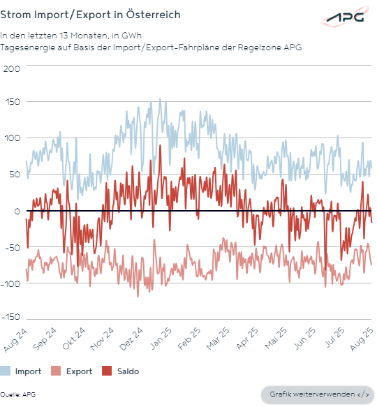 Aufgrund der guten Produktion aus Erneuerbaren ergab sich über den Gesamtmonat August 2025 in Österreich (Regelzone APG*) per Saldo ein Export in der Höhe von 426 GWh (auf Basis der Fahrpläne), wobei an 23 Tagen bilanziell Strom ins Ausland exportiert werden konnte. Ein anderes Bild zeichnete sich im Vergleichsmonat des Vorjahres: Im August 2024 war Österreich Import-Land (30 GWh per Saldo), wobei damals nur an 12 Tagen ein bilanzieller Stromexport verzeichnet werden konnte.