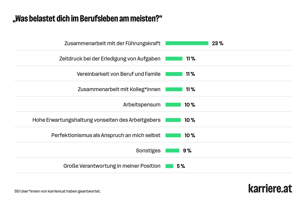 Bei den Ursachen für Stress am Arbeitsplatz gab fast ein Viertel der Befragten (23 Prozent) an, dass die Zusammenarbeit mit der Führungskraft sie am meisten belaste, gefolgt vom Zeitdruck bei der Erledigung von Aufgaben, der Vereinbarkeit von Beruf und Familie und der Zusammenarbeit mit Kolleg*innen (je 11 Prozent).