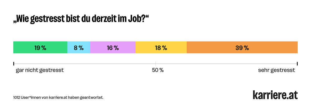 Über die Hälfte der Jobsuchenden fühlen sich sehr oder eher gestresst im Berufsleben. Das ergab eine Umfrage auf karriere.at anlässlich des Welttags für psychische Gesundheit am 10. Oktober. 39 Prozent der Befragten gaben an, sehr gestresst im Job zu sein, 18 Prozent fühlen sich derzeit eher gestresst im Berufsleben. Für 62 Prozent ist das hohe Stresslevel dabei auch ein Grund für ihren Wunsch nach einem Jobwechsel.
