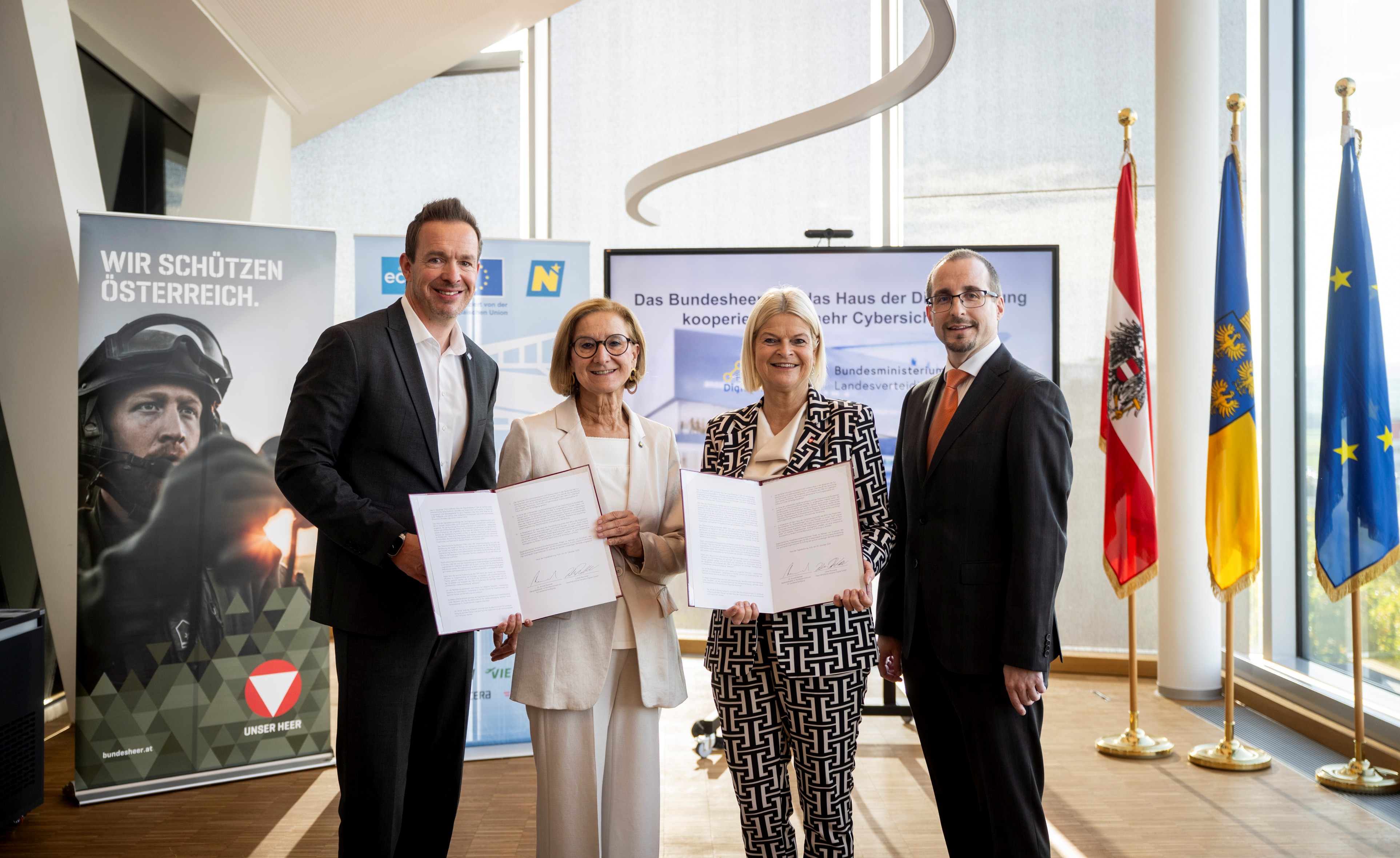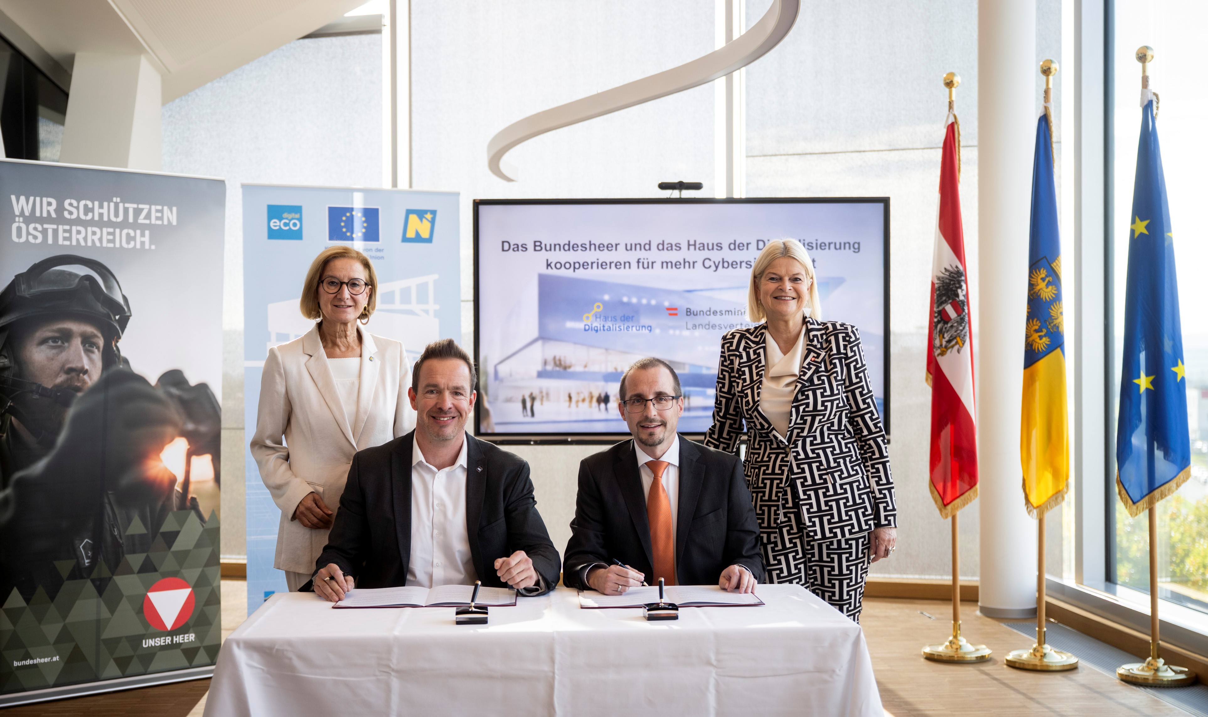 Am Montag, dem 20. Oktober, unterzeichneten Arnold Kammel, Generalsekretär des Verteidigungsministeriums, und Lukas Reutterer, Haus der Digitalisierung Geschäftsführer, eine Kooperationsvereinbarung im Beisein von Verteidigungsministerin Klaudia Tanner und der niederösterreichischen Landeshauptfrau Johanna Mikl-Leitner. Ziel der Zusammenarbeit ist es, die Cybersicherheit und die digitale Widerstandskraft in Österreich zu stärken.
