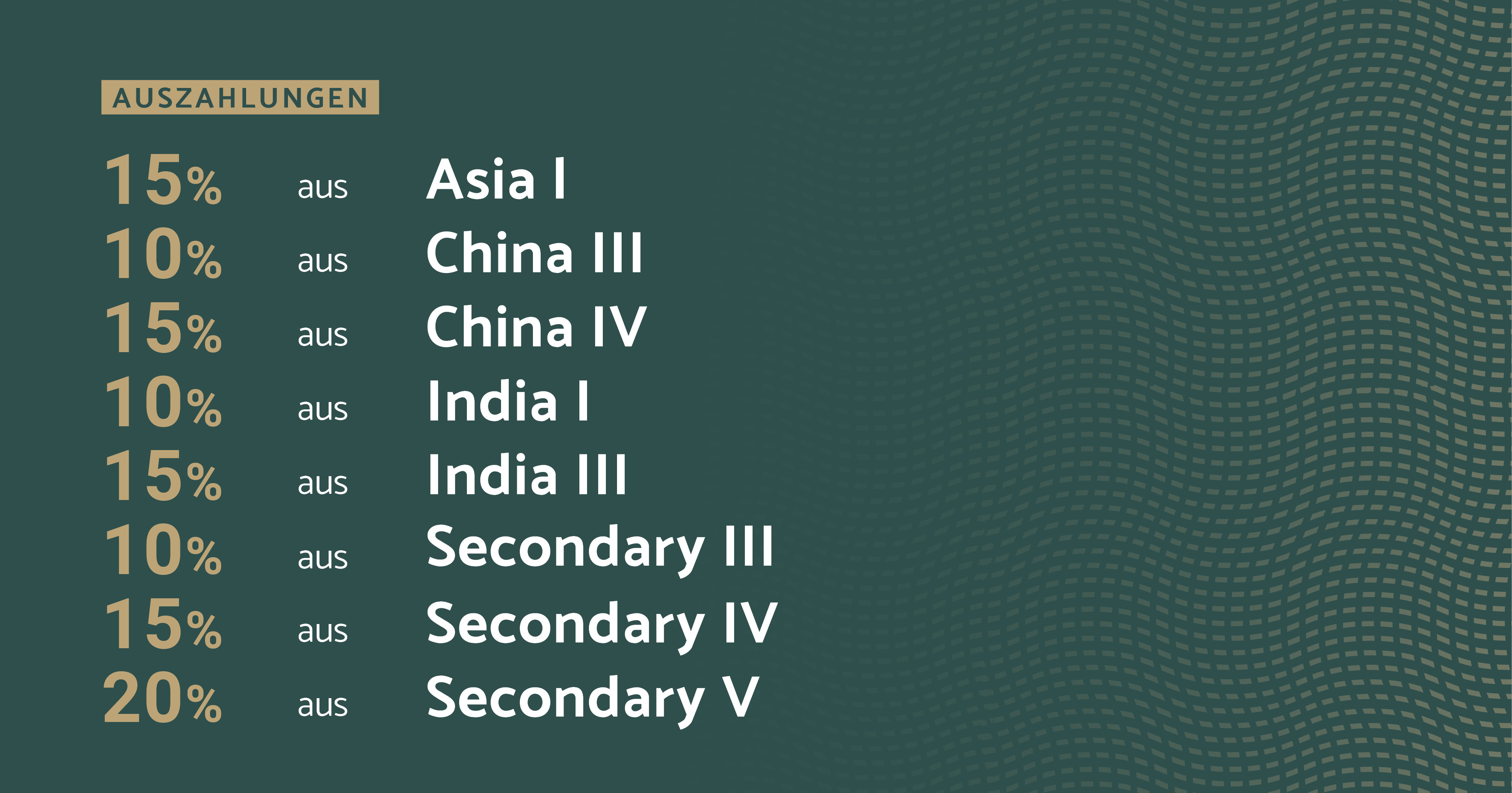 Anlegerinnen und Anleger der beiden Fonds Asia I und Secondary III erreichen mit den kommenden Auszahlungen die Gewinnschwelle. India I und III haben diese bereits deutlich überschritten. Alle genannten Private-Equity-Dachfonds befinden sich in der so genannten Auszahlungsphase. Sobald diese beginnt, werden Rückflüsse aus erfolgreichen Unternehmensverkäufen nicht weiter reinvestiert, sondern plangemäß in Tranchen an die Anleger ausgezahlt.