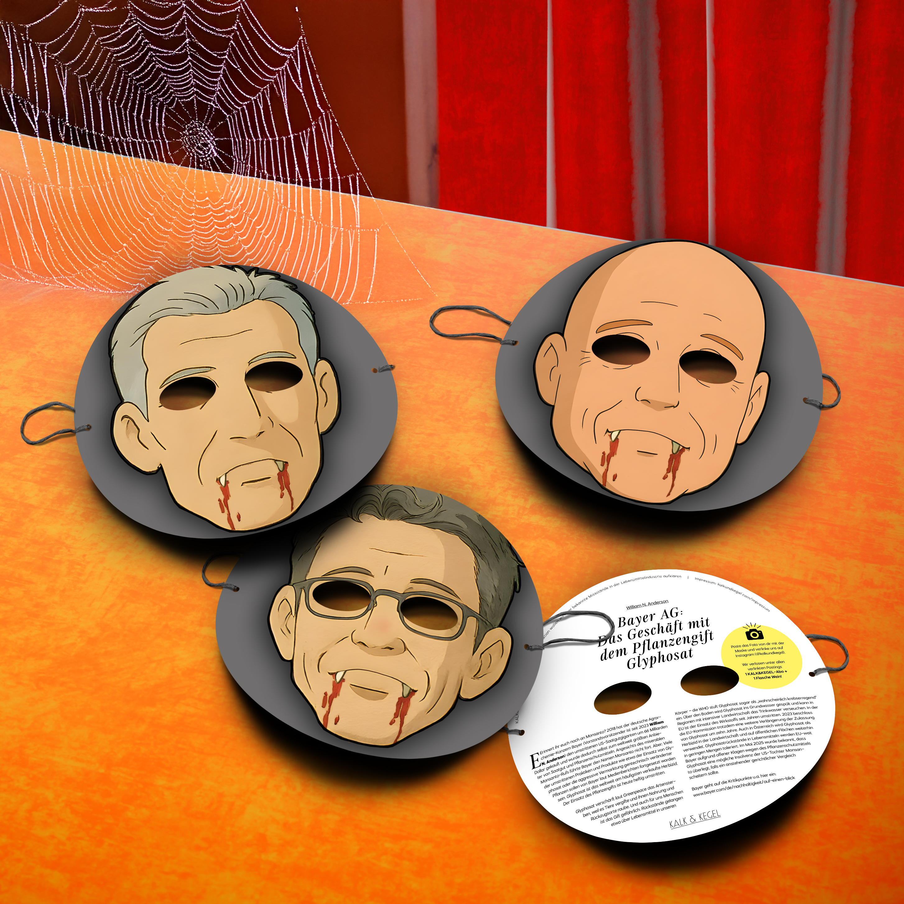 Es ist eine mutige Aktion, mit der sich das aufstrebende Kulinarik- und Weinmagazin KALK&KEGEL jetzt die großen Konzerne vorknöpft. Es geht um bekannte Kritikpunkte gegen Großkonzerne wie Nestlè, Mondelēz (u.a. Milka, Oreo, Toblerone) oder Bayer, die von möglicher Kinderarbeit bis hin zu dreisten Werbelügen reichen. KALK&KEGEL nimmt das zum Anlass und bringt rechtzeitig vor Halloween nun eine Masken-Serie heraus mit den Gesichtern der CEOs dieser drei Konzerne – Philipp Navratil (CEO Nestlé), Dirk Van de Out (CEO Mondelēz International) und William N. Anderson (CEO Bayer AG).