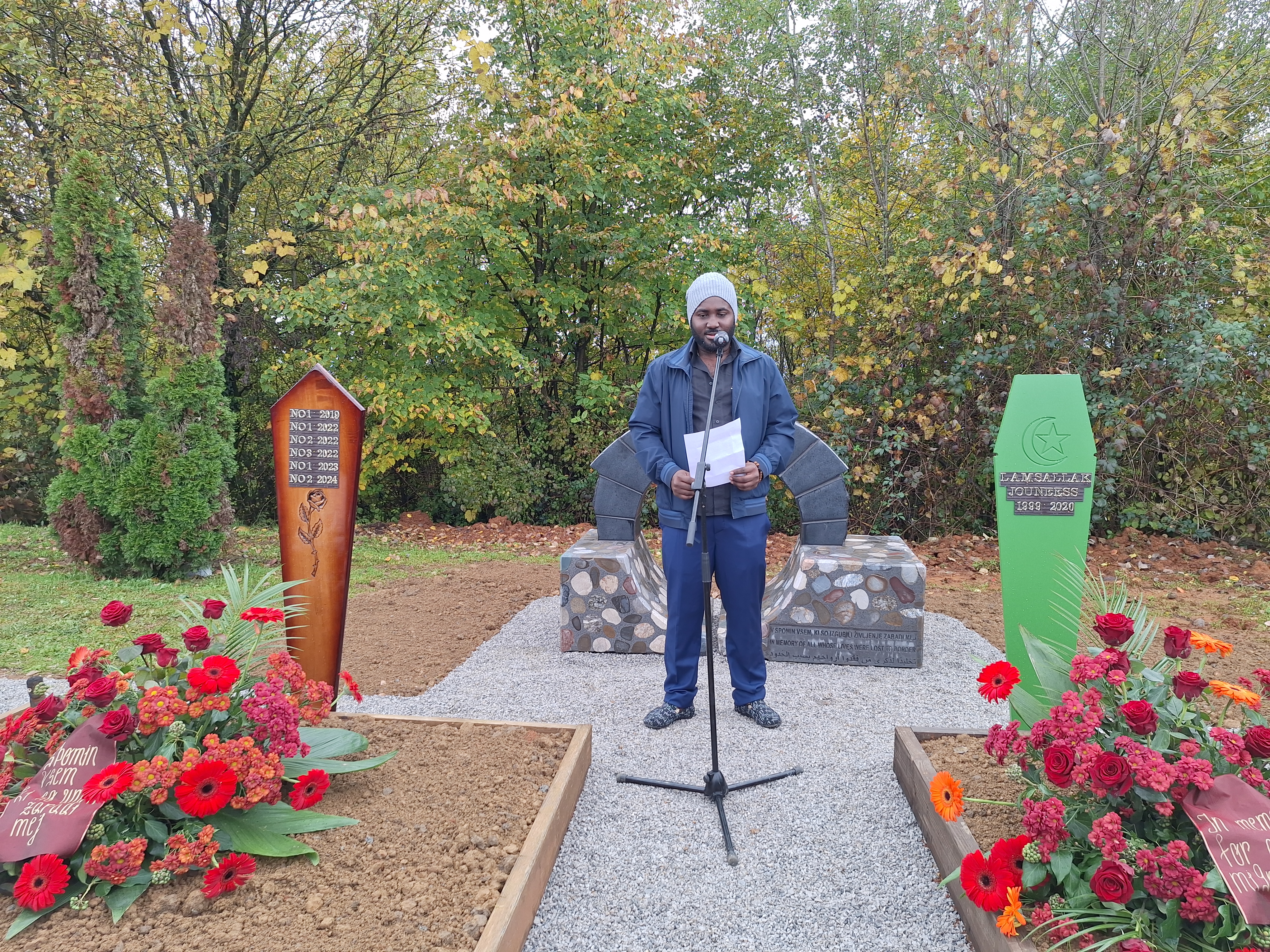 Das Denkmal, initiiert von der slowenischen Gruppe „Prehod“ und finanziert von der österreichischen NGO SOS Balkanroute, wurde auf dem Friedhof hinter neun Gräbern ertrunkener und großteils nicht identifizierter Geflüchteter errichtet. Den Feierlichkeiten wohnten aus Österreich neben Vertreter:innen von SOS Balkanroute auch Mitglieder des Pfarrnetzwerks Asyl bei.