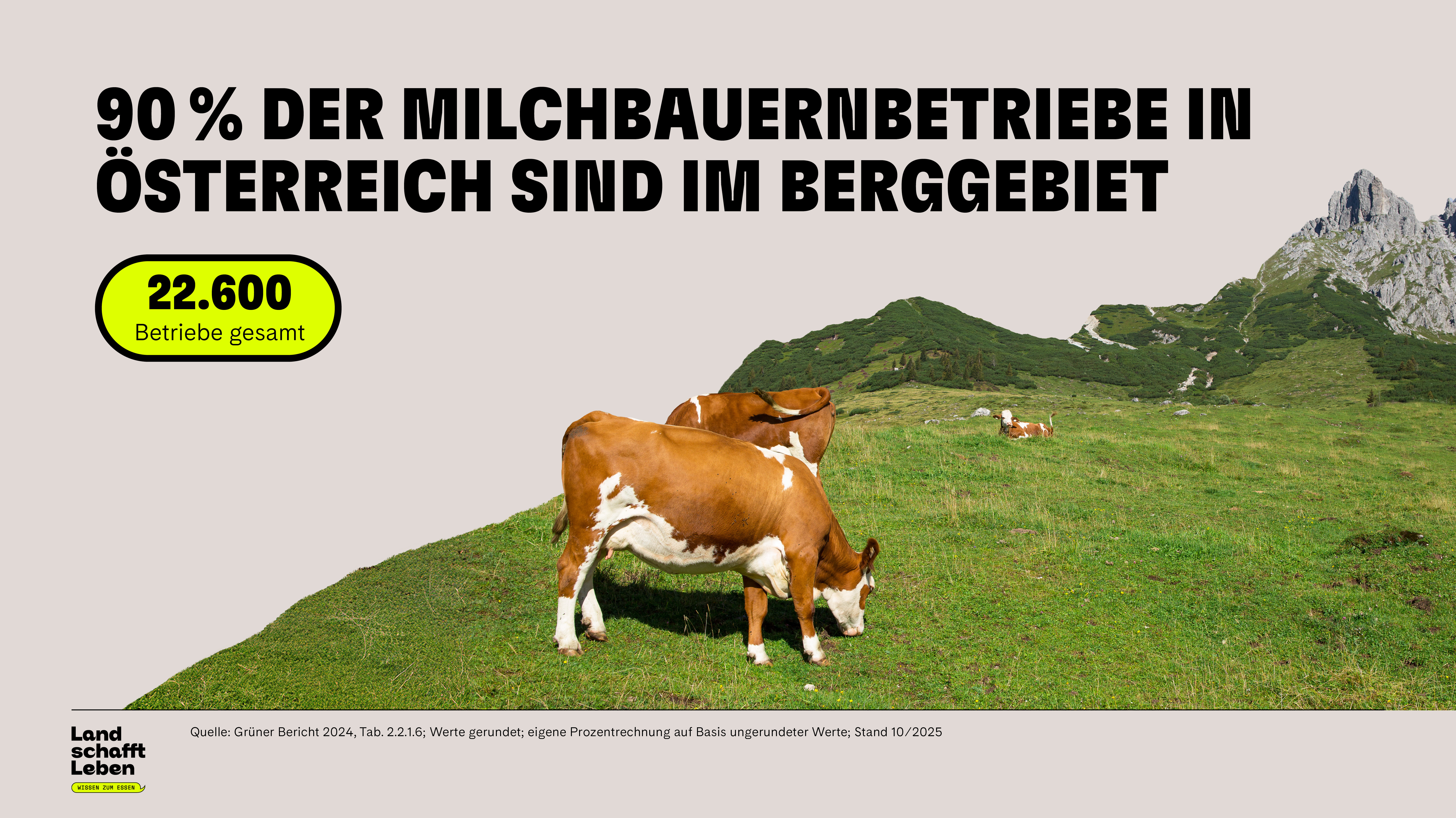 Gemeinsam mit Irland produziert Österreich die klimafreundlichste Milch der EU und ist damit auch global vorn dabei. Das hat vor allem drei Gründe: Die heimischen Milchbäuerinnen und -bauern setzen auf einen hohen Grünlandanteil in der Fütterung und produzieren einen großen Teil ihres Futters selbst, anstatt sie aus Ländern wie Südamerika zu beziehen. Dadurch entstehen deutlich weniger Emissionen durch Landnutzungsänderungen, wie das etwa der Fall ist, wenn Regenwaldflächen zugunsten der Sojaproduktion gerodet werden. Die heimische Milchwirtschaft setzt außerdem stark auf die Zweinutzungsrasse „Fleckvieh“. Diese Rasse zeigt sowohl bei Milch als auch bei Fleisch gute Leistungen, wodurch sich die Emissionen im Gesamtsystem auf eine größere Produktmenge verteilen. Zudem leben die Kühe hierzulande durchschnittlich länger als in vielen anderen Ländern, dadurch entstehen ebenfalls weniger Emissionen pro Liter Milch, den die Kuh gibt.