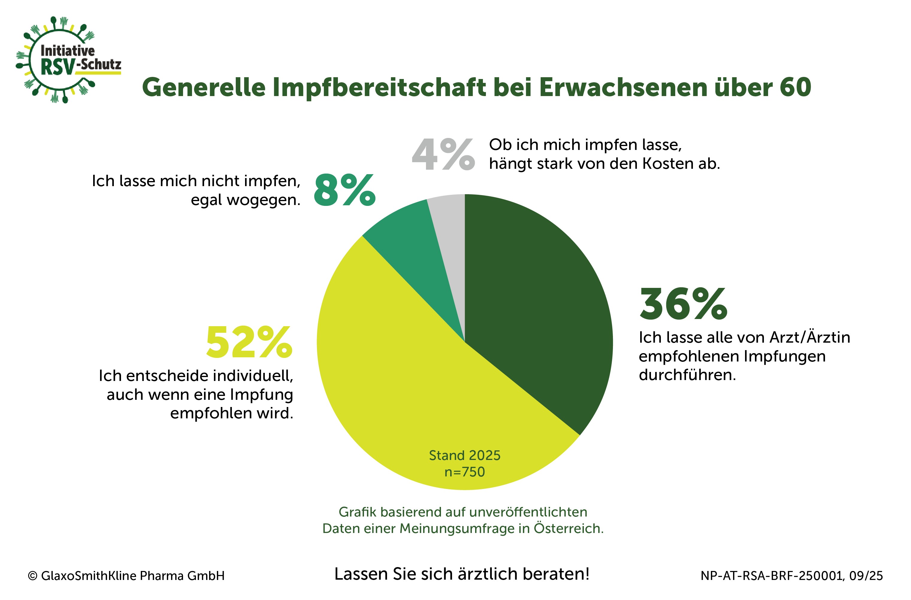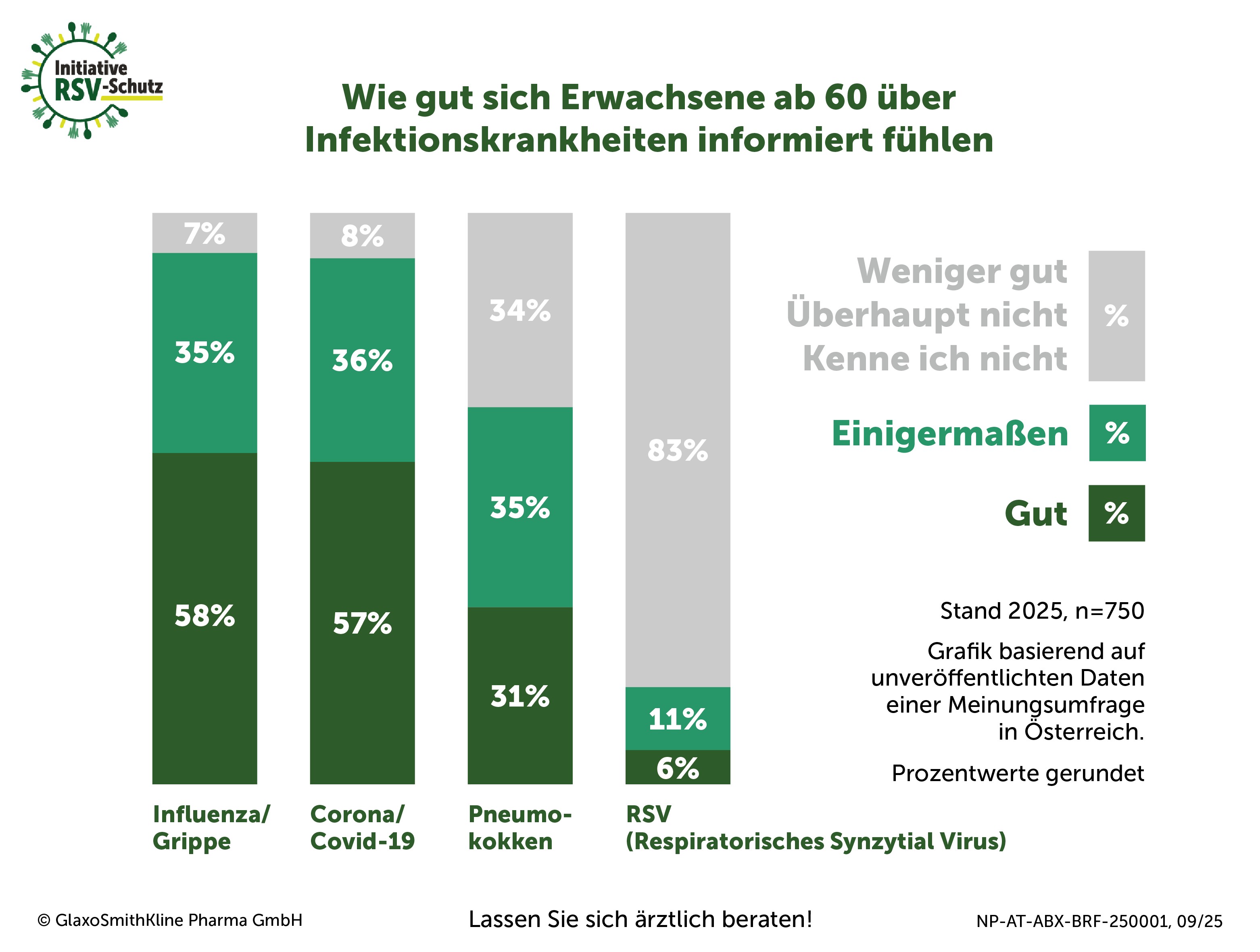 Im österreichischen Impfplan wird eine RSV-Impfung für Menschen ab 60 Jahren allgemein empfohlen. Sprechen Sie mit einem Arzt oder Ihrer Ärztin Ihres Vertrauens. Weitere Informationen finden Sie unter www.rsv-schutz.at und auf Facebook unter Initiative RSV Schutz.