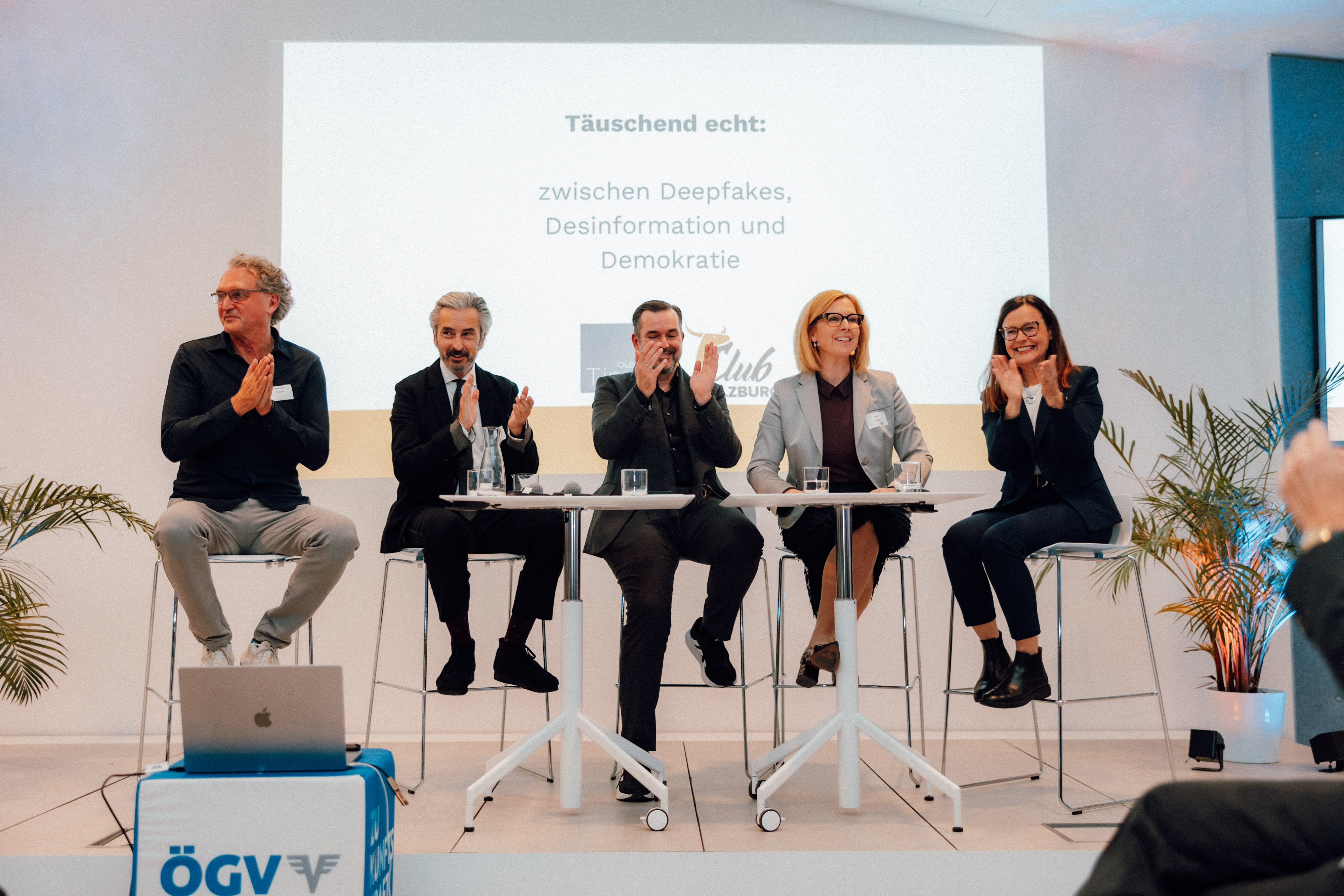 Bei der folgenden Diskussion – moderiert von Club Salzburg-Vizepräsidentin Karin Strobl – saßen neben den beiden Vorredner mit am Podium Esther Mitterstieler, Landesdirektorin des ORF Tirol, sowie Wirtschafts- und Innenpolitik-Redakteur Hermann Fröschl von den Salzburger Nachrichten. Dabei wurde etwa empfohlen, KI als ein brauchbares Werkzeug zwar einzusetzen, dabei aber nie „den Hausverstand zu vergessen.“ Medien müssten den Mut zur Lücke haben, sich also nicht von der unglaublichen Geschwindigkeit der (Fake-)Nachrichtenverbreitung in der digitalen Welt treiben zu lassen und damit echtes, aber zeit- und kostenintensives Recherchieren aufzugeben. Im Umgang mit den Social Media-Plattformen ebenso wie mit KI-Programmen gehörten nicht nur, aber vor allem junge Menschen geschult und aufgeklärt. Für manche sei ChatGPT & Co. ja schon zum allumfassenden Lebensberater geworden. Härtere gesetzliche (europäische) Regelungen für die großen Tech-Plattformen wäre vermutlich ebenso ratsam.