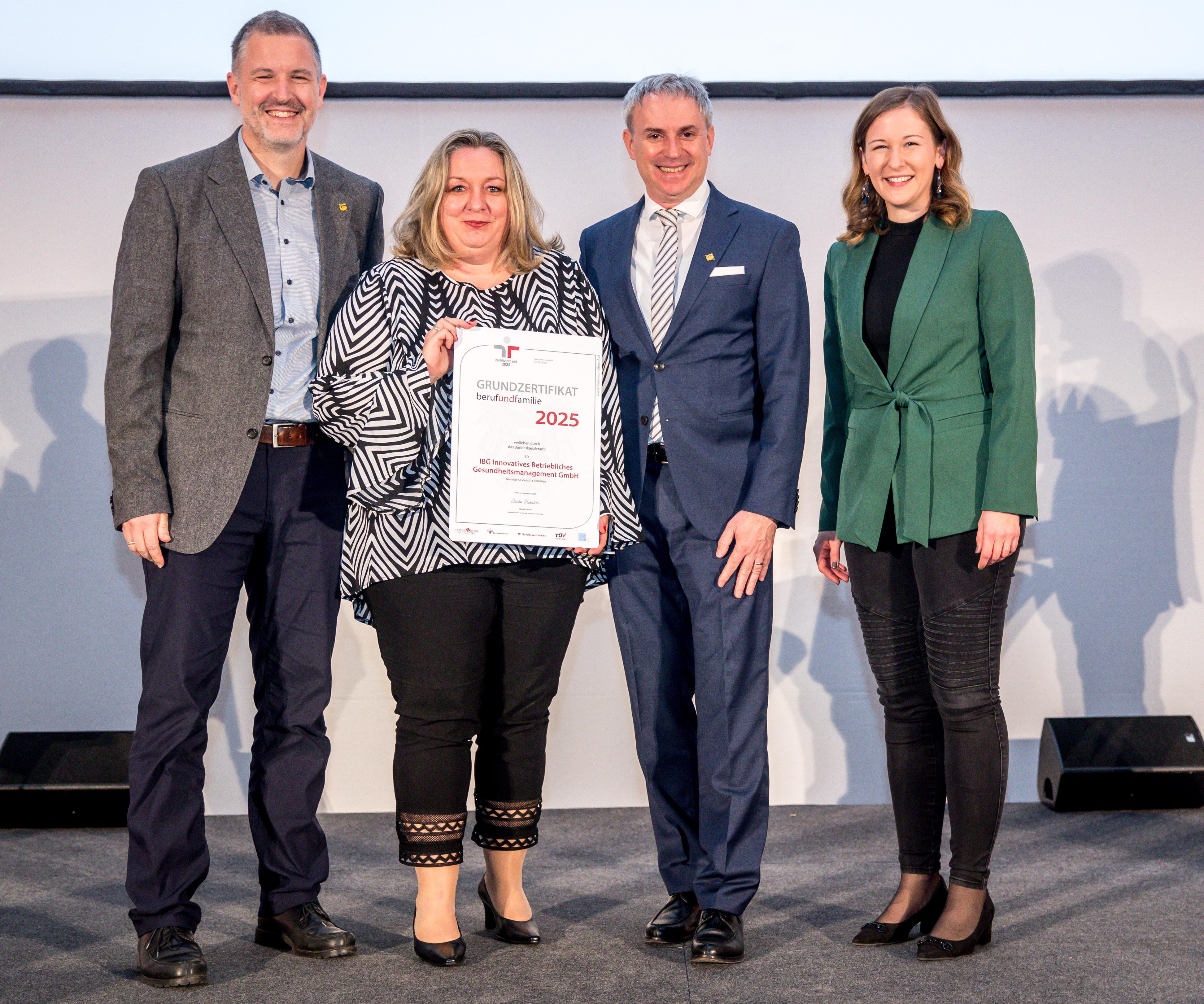 Die IBG GmbH (Innovatives Betriebliches Gesundheitsmanagement) GmbH) wurde mit dem staatlichen Gütezeichen „Familienfreundliches Unternehmen“ ausgezeichnet. Die Verleihung fand im feierlichen Rahmen der Aula der Wissenschaften in Wien statt, gemeinsam mit mehr als 100 weiteren Organisationen. Überreicht wurde die Auszeichnung von Familienministerin Claudia Plakolm, die die Bedeutung familienfreundlicher Arbeitsbedingungen für die Zukunft Österreichs hervorhob.