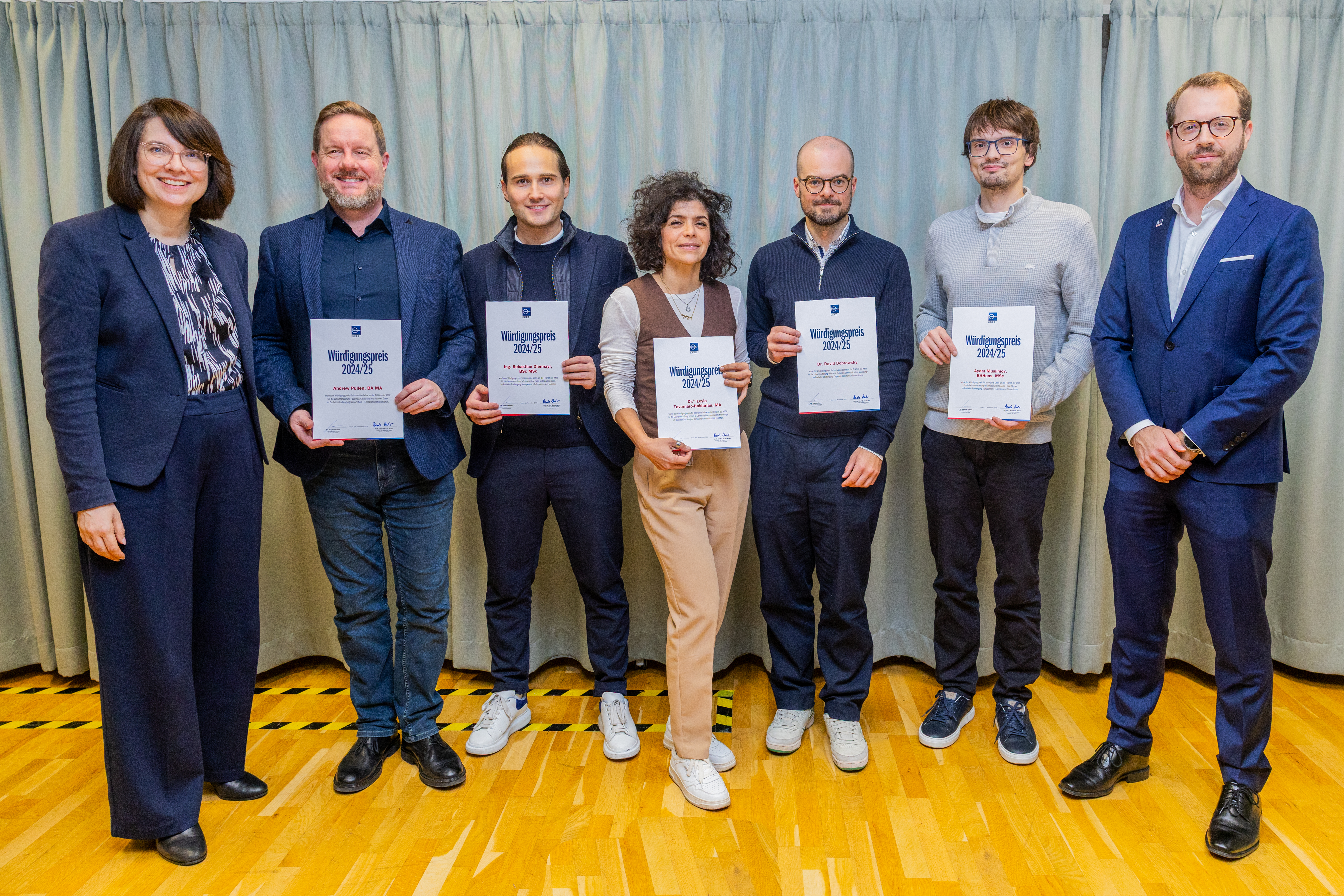 Kollegiumsleiterin Beate Huber, die Gewinnerinnen und Gewinner der Würdigungspreise Andrew Pullen, Sebastian Diermayr, Leyla Tavernaro-Haidarian, David Dobrowsky und Aydar Muslimov sowie Geschäftsführer Stephan Gasser bei der Verleihung der Lehrpreise 2025 der FHWien der WKW (v. l.).