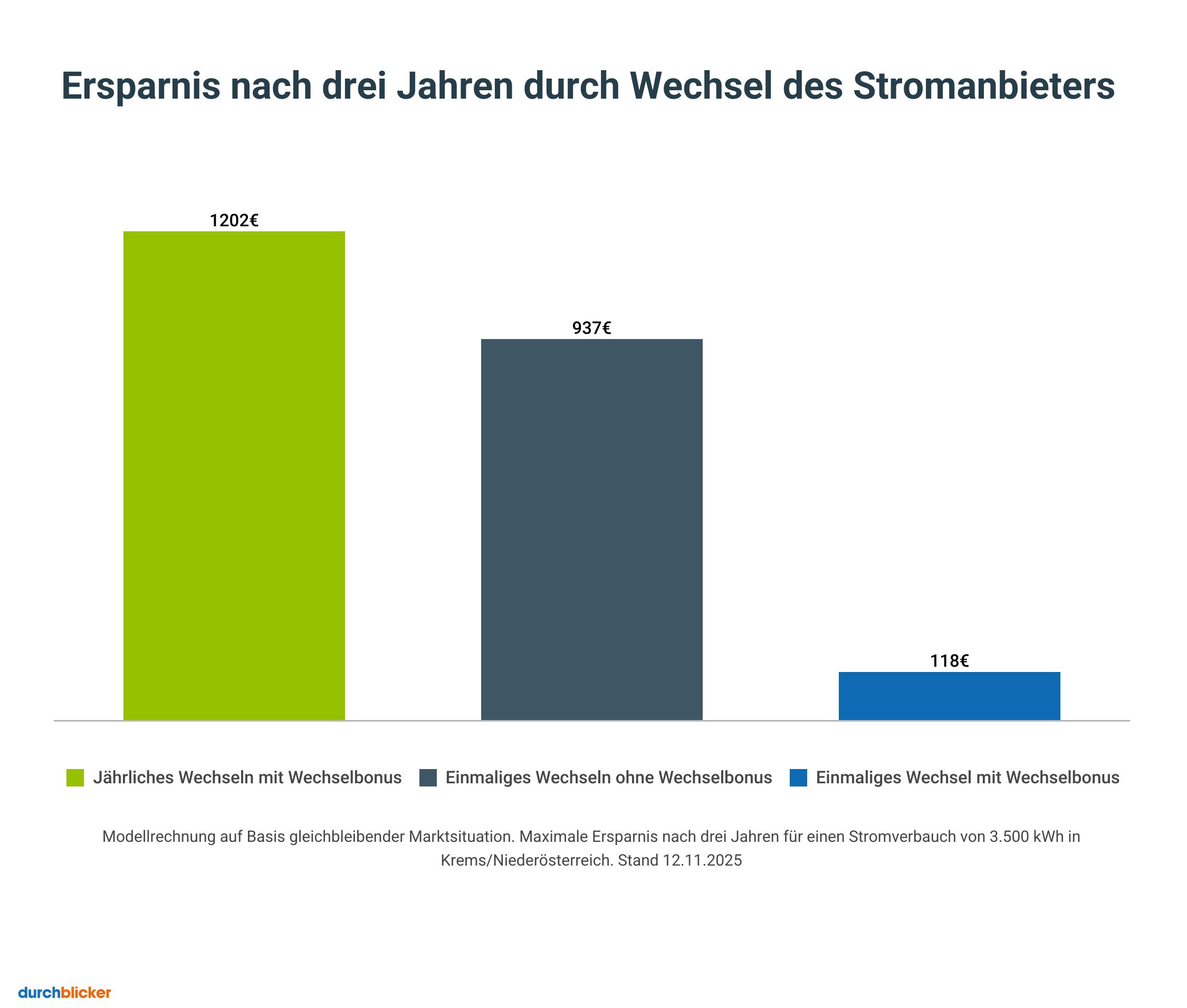 „Wechselboni sind ein starker Hebel, um die Energiekosten zu senken – vorausgesetzt, man wechselt regelmäßig“, erklärt Spiegelhofer. Denn wer jetzt nur einmalig vom regionalen Standardanbieter zum günstigsten Stromanbieter inklusive Wechselbonus wechselt, spart in Niederösterreich innerhalb von drei Jahren lediglich 118 Ꞓ. Warum diese Ersparnis nicht höher ist? Der großzügige Wechselbonus gilt nur für das erste Vertragsjahr und fällt in den Folgejahren weg. Der gewählte Stromanbieter ist ab dem zweiten Jahr also deutlich teurer als zu Beginn. “Wir empfehlen darum allen, die vor einem Jahr einen Energievertrag mit Wechselbonus abgeschlossen haben, sich nach einem neuen Vertrag mit Wechselbonus umzusehen”, so Spiegelhofer.