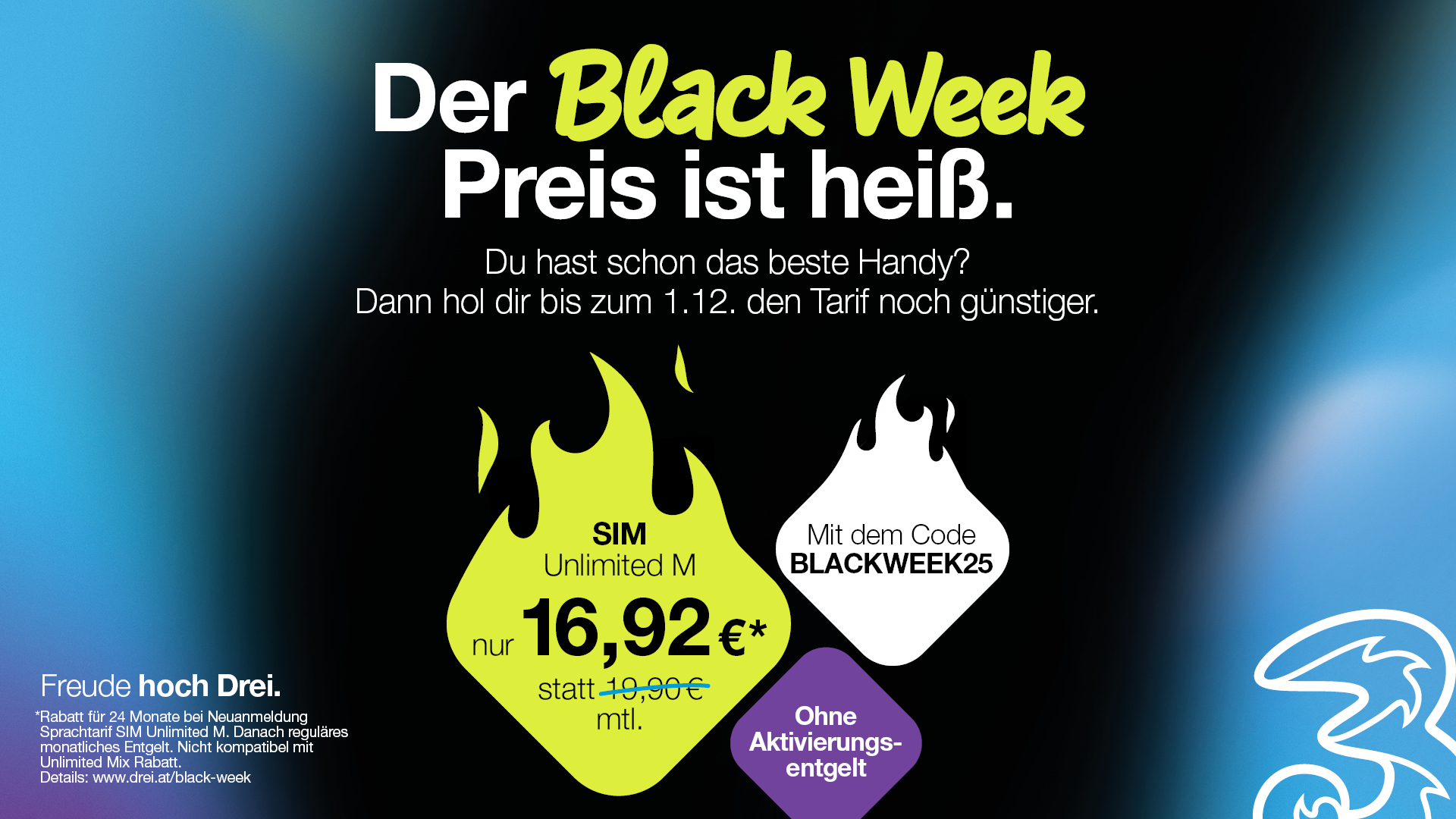 Nur von 24. November bis 1.Dezember 2025 in allen Drei Shops und auf drei.at Blackweek Rabatt über Gutscheincode BLACKWEEK25.