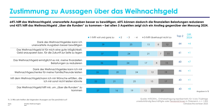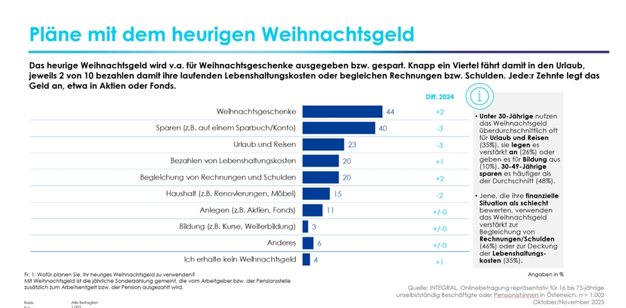 „Am spannendsten ist die emotionale Dimension dieser Zahlen“, sagt Petra Starecek, Studienleiterin bei INTEGRAL. „Weihnachtsgeld war früher emotional positiv besetzt – als Zeichen der Wertschätzung oder Belohnung. Heute ist es für viele eine Art Überlebensbudget. Gleichzeitig beobachten wir aber auch einen wachsenden Trend zu bewussterem Umgang mit Geld – besonders bei jungen Menschen und Familien, die gezielt Rücklagen bilden."