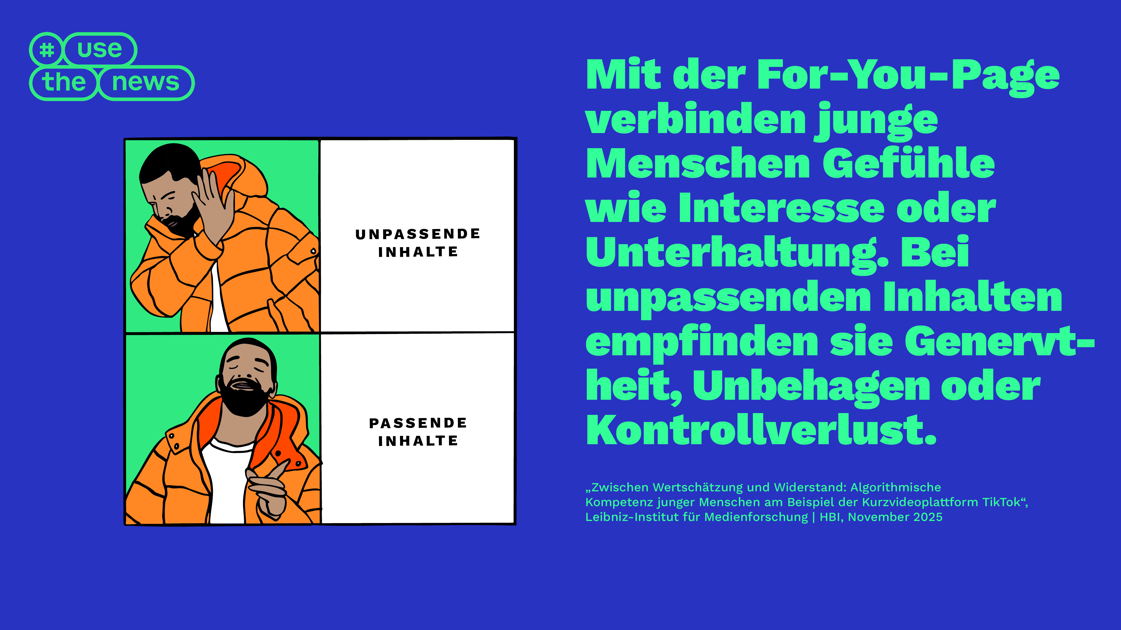 TikTok gewinnt für Nachrichten und Politik zunehmen an Relevanz. Für Medienanbieter und politische Akteure ist die Plattform ein wichtiger Ausspielweg, für Nutzerinnen und Nutzer zunehmend eine Informationsquelle. Junge Menschen ignorieren dabei aber meist, dass sie durch den TikTok-Algorithmus vielfältigen Manipulationen ausgesetzt sein können. Eine neue qualitative #UseTheNews-Studie des Leibniz Instituts für Medienforschung bringt die zeitgemäße Vermittlung von Nachrichten-, Informations- und Medienkompetenz ins Spiel, um fit zu machen gegen die Beeinflussungen der Algorithmen. Die Autorinnen und Autoren zeigen auf, wie Jugendliche und junge Erwachsene die Plattform nutzen, wie sie mit dem Algorithmus interagieren und wie sie Wertschätzung und Widerstand erleben.