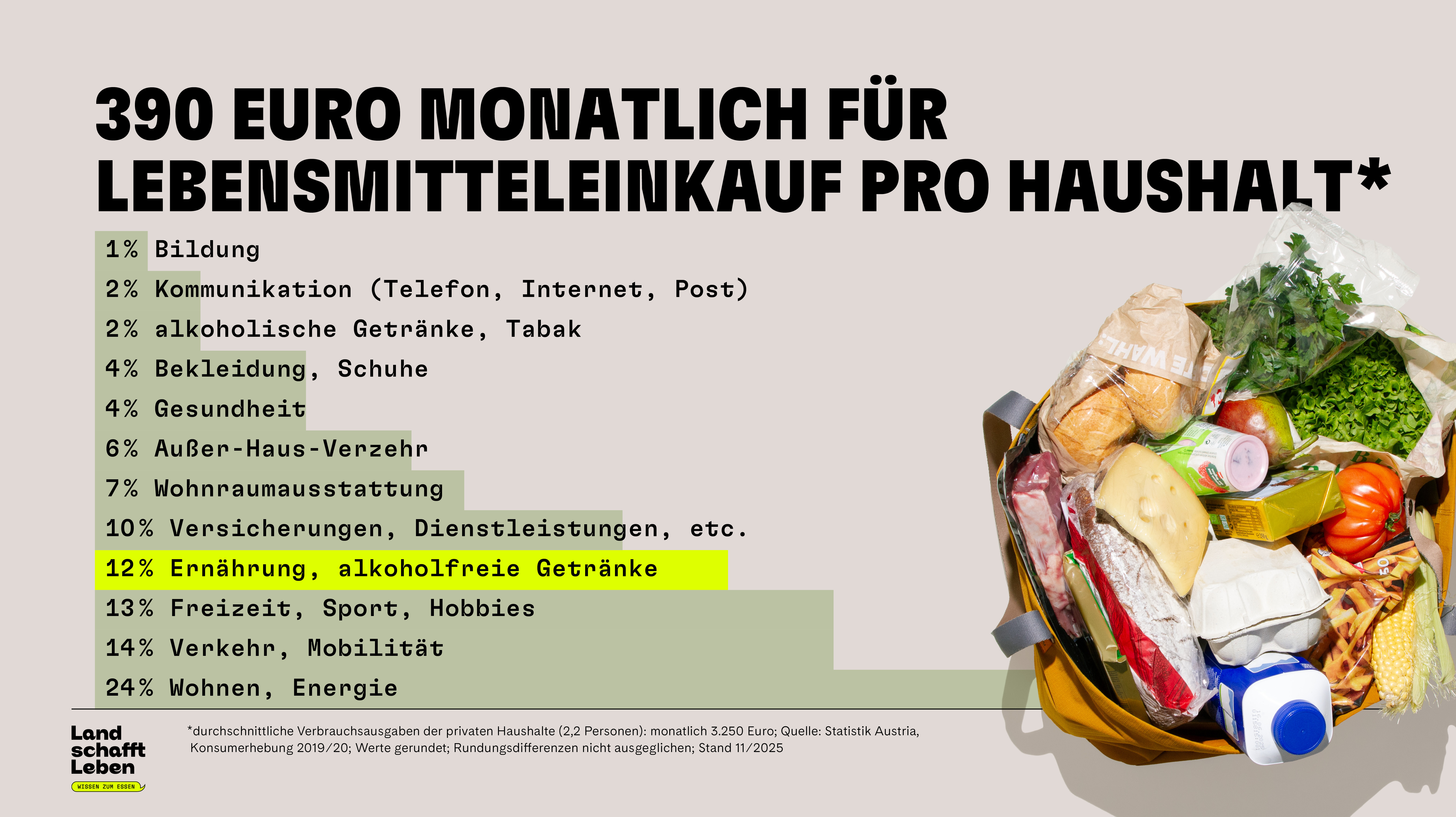 In Österreich fließen durchschnittlich zwölf Prozent der gesamten Haushaltsausgaben in Ernährung und alkoholfreie Getränke – Ausgaben in Restaurants und außer Haus ausgenommen. Das ist einer der niedrigsten Werte in Europa. Den größten Teil der monatlichen Verbrauchsausgaben machen Wohnen und Energie mit knapp einem Viertel aus. Für Freizeit, Sport und Hobbys wird etwas mehr ausgegeben als für Lebensmittel, nämlich 13 Prozent.