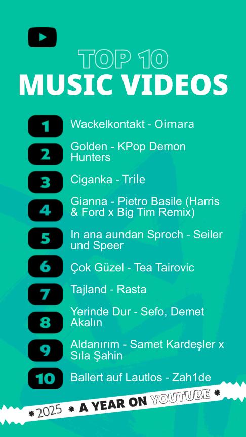 Die Liste der Top 10 Musikvideos ist eine Mischung aus verschiedenen Musikgenres. Mit der Band Seiler und Speer und dem DJ-Duo Harris & Ford sind auch österreichische Künstler im Ranking vertreten. Nummer eins ist der bayerische Sänger Oimara mit dem Hit „Wackelkontakt", gefolgt von einem Lied der fiktiven K-Pop-Girlgroup aus dem Animationsfilm „KPop Demon Hunters".