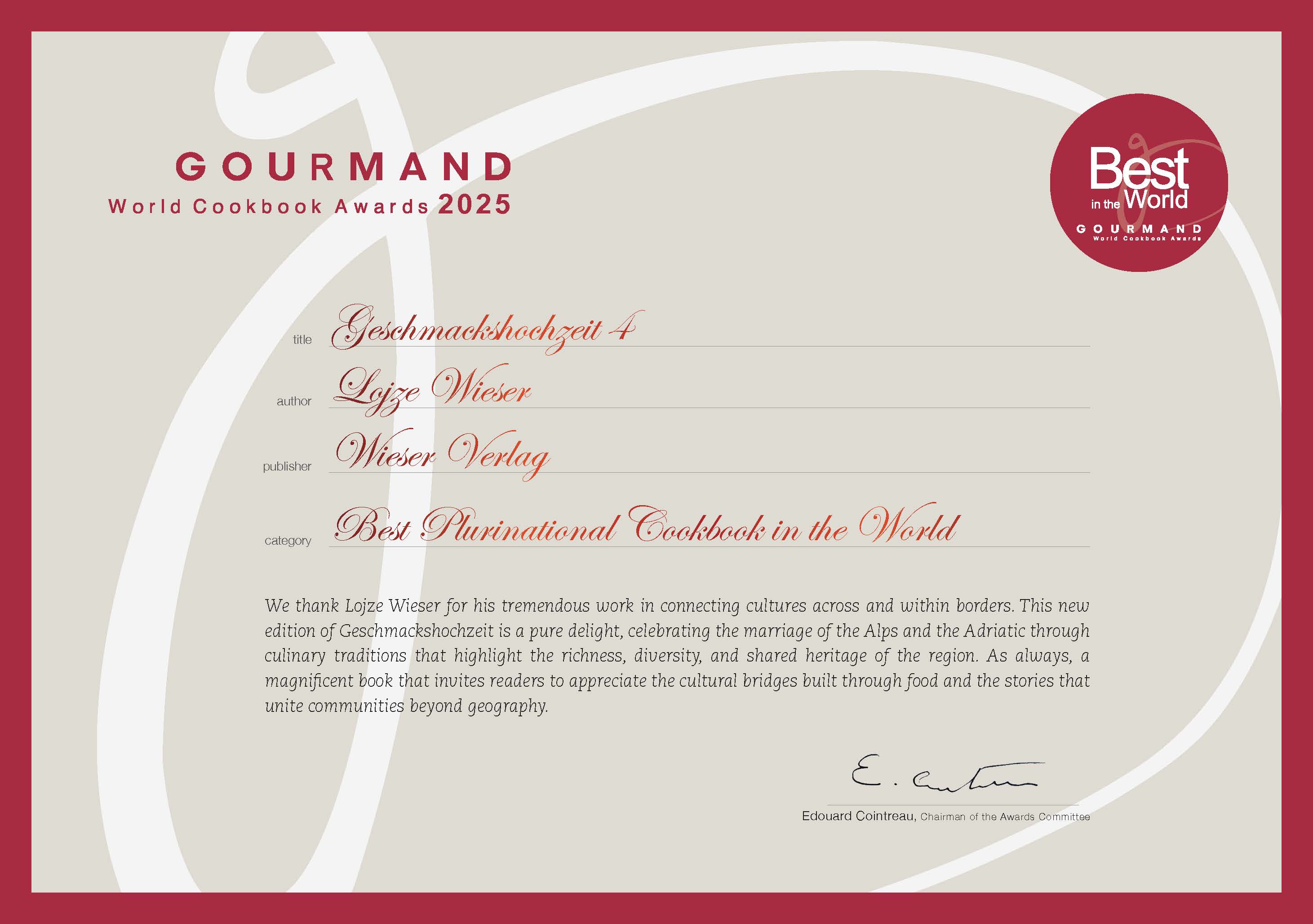 Bei den Gourmand Awards wurde „Geschmackshochzeit IV" zum „Best Plurinational Cookbook in the World“ gekürt. Die Bekanntgabe erfolgte beim Saudi Feast Food Festival in Riad, wo Edouard Cointreau, Präsident der Gourmand Awards, das Buch für seine erzählerische Tiefe und kulturelle Bedeutung lobte: „Wir danken Lojze Wieser für seine großartige Arbeit, mit der er Kulturen über Grenzen hinweg und innerhalb von Grenzen miteinander verbindet. Diese neue Ausgabe von ‚Geschmackshochzeit‘ ist ein reines Vergnügen und feiert die Verbindung der Alpen und der Adria durch kulinarische Traditionen, die den Reichtum, die Vielfalt und das gemeinsame Erbe der Region hervorheben. Ein großartiges Buch!“