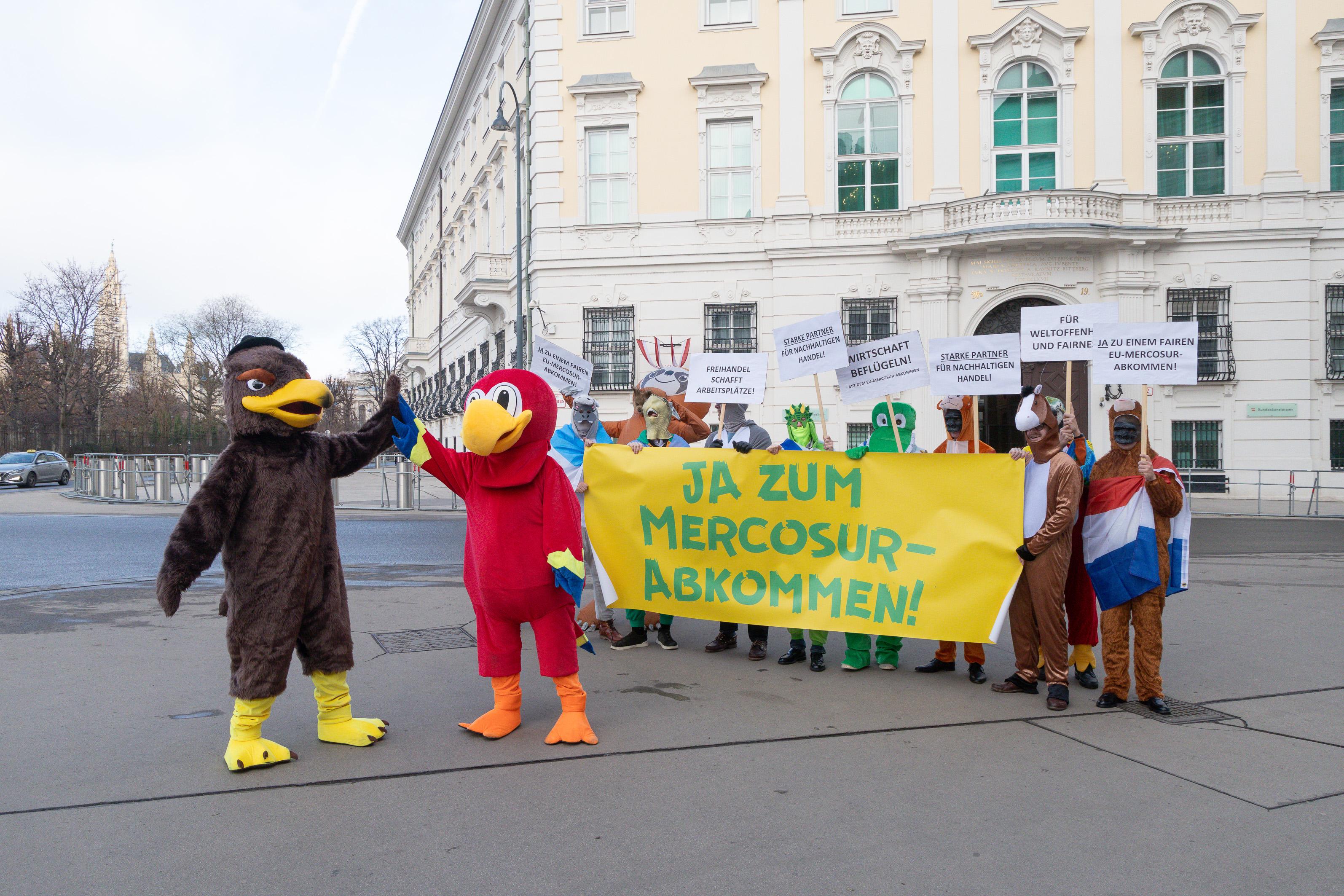 Die Industriellenvereinigung (IV) macht neuerlich auf die Bedeutung des Mercosur-Abkommens aufmerksam. Diesmal in Form einer Demonstration von Vogelmaskottchen vor dem Bundeskanzleramt. Dabei trifft der südamerikanische Ara auf den österreichischen Adler. Begleitet von ihren tierischen Freunden, weisen sie gemeinsam und auf humorvolle Art auf die Vorteile des geplanten Freihandelsabkommens mit den Mercosur-Staaten – Brasilien, Argentinien, Paraguay und Uruguay – hin. „Das Abkommen mit Lateinamerika ist ein wichtiger Impuls für die österreichische Industrie und Wirtschaft insgesamt. In Zeiten von Inflation und Stagnation müssen wir alle Chancen ergreifen, die am Tisch liegen – daher muss auch die Bundesregierung entsprechende Schritte setzen und den Weg zu einer Zustimmung auf EU-Ebene freiräumen“, appelliert IV-Generalsekretär Christoph Neumayer.