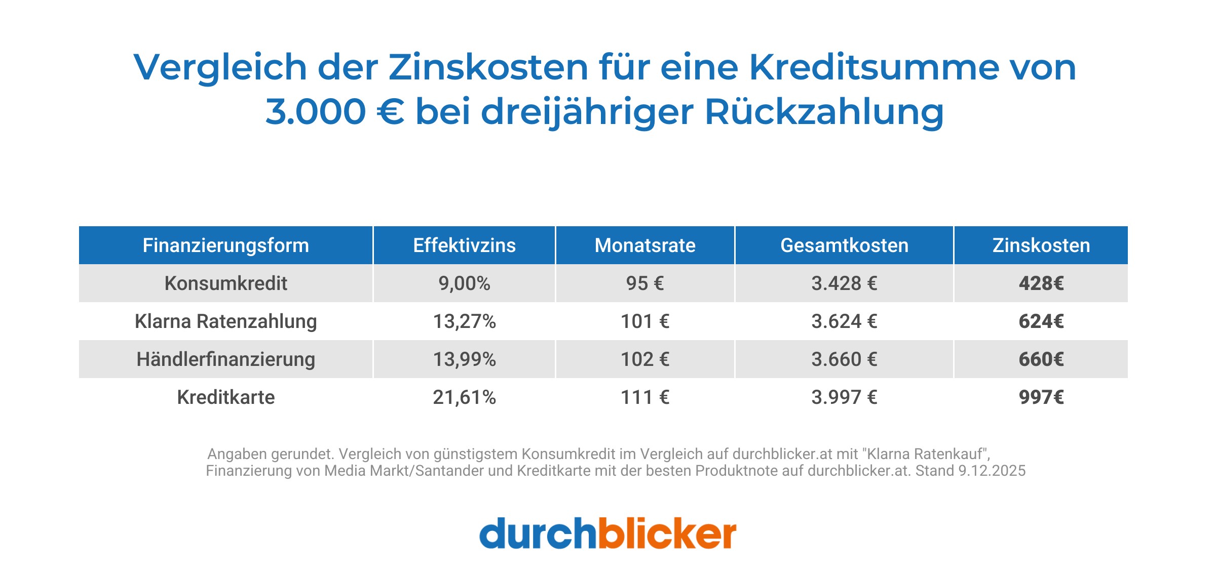 Konsumkredit schlägt Klarna, Händlerfinanzierung und Kreditkarte – durchblicker rät zu Vergleich vor Abschluss.