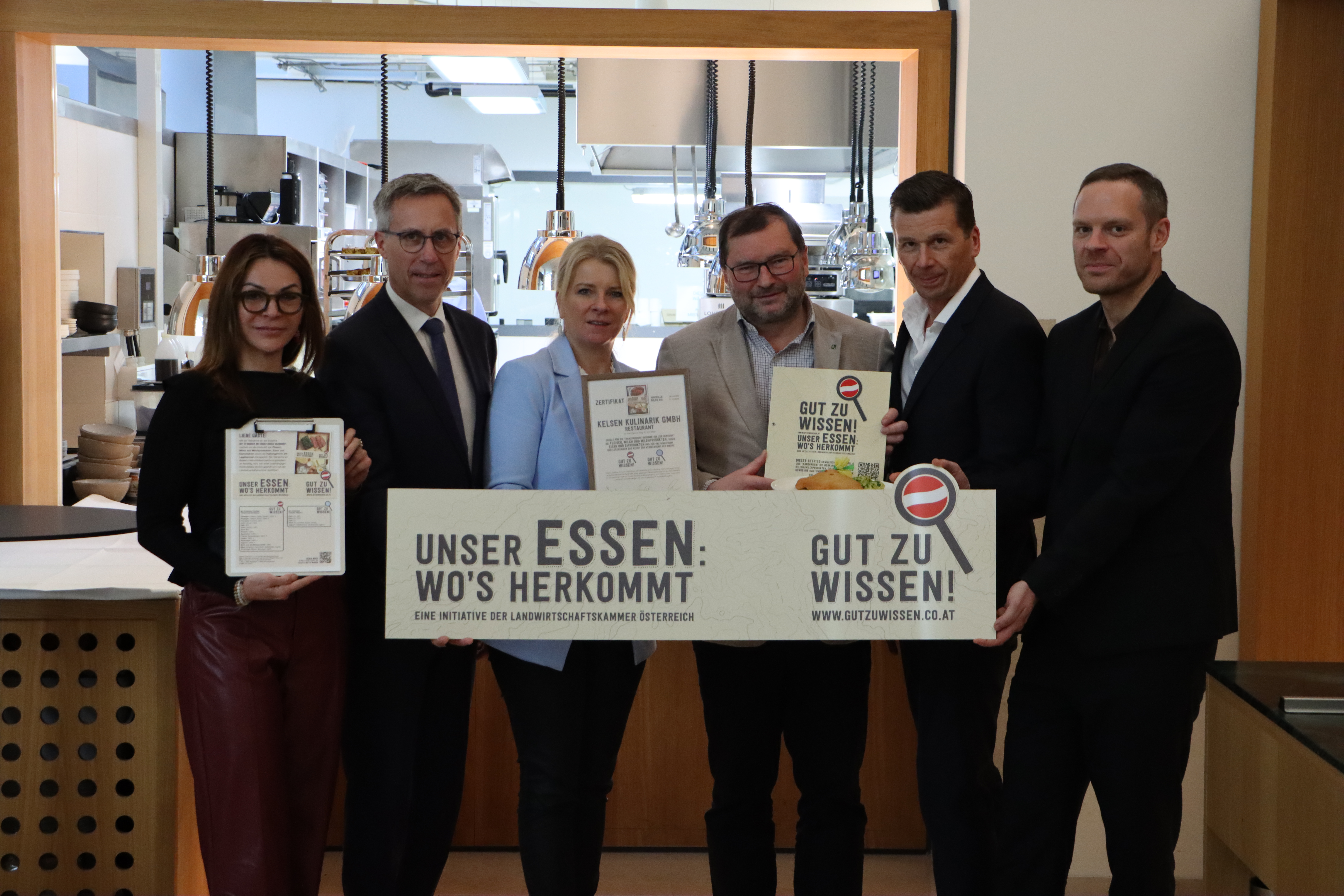 Die Kelsen Kulinarik GmbH, verantwortlich für das Restaurant, die Kantine und das Catering im Österreichischen Parlament, ist ab sofort Teil des freiwilligen, transparenten Herkunftskennzeichnungssystems GUT ZU WISSEN der Landwirtschaftskammer Österreich (LKÖ). Nach erfolgreich durchlaufener Kontrolle durch eine unabhängige, akkreditierte Kontrollstelle wurde nun das Zertifikat offiziell überreicht. Die Verleihung erfolgte durch Bauernbund-Präsident Abg.z.NR Georg Strasser, Bundesbäuerin Abg.z. NR Irene Neumann Hartberger und LK-Wien-Präsident Norbert Walter.